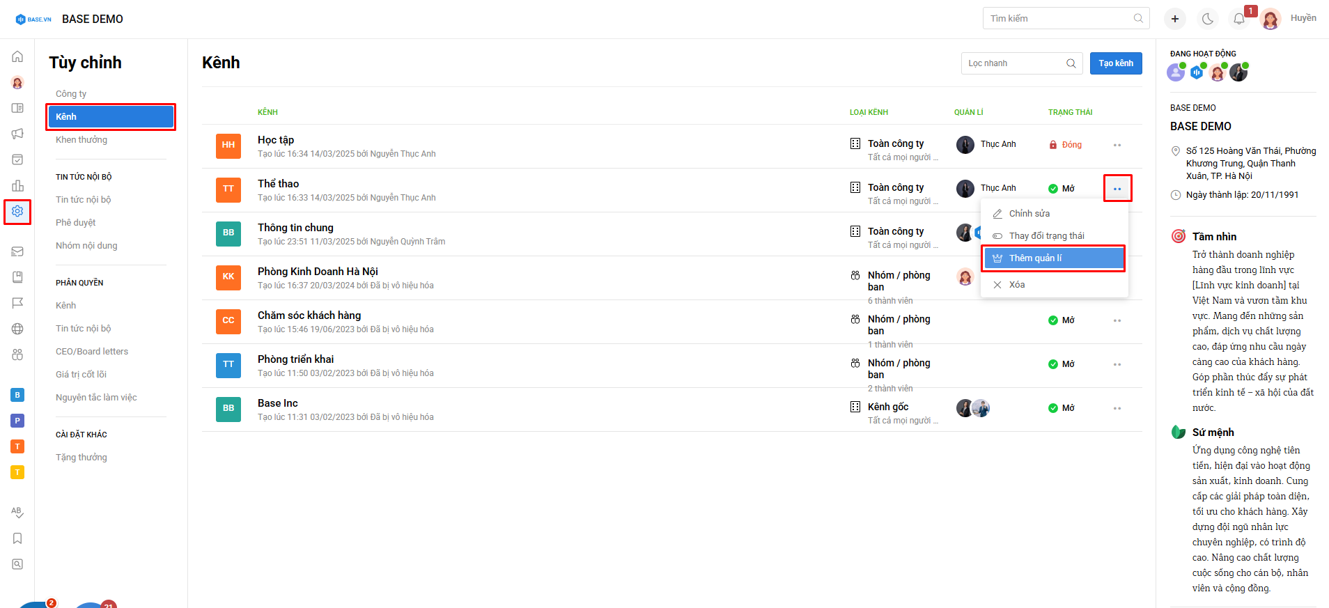 Bước 2: Chọn kênh cần quản lý >> Click icon 2 chấm >> Thêm quản lí