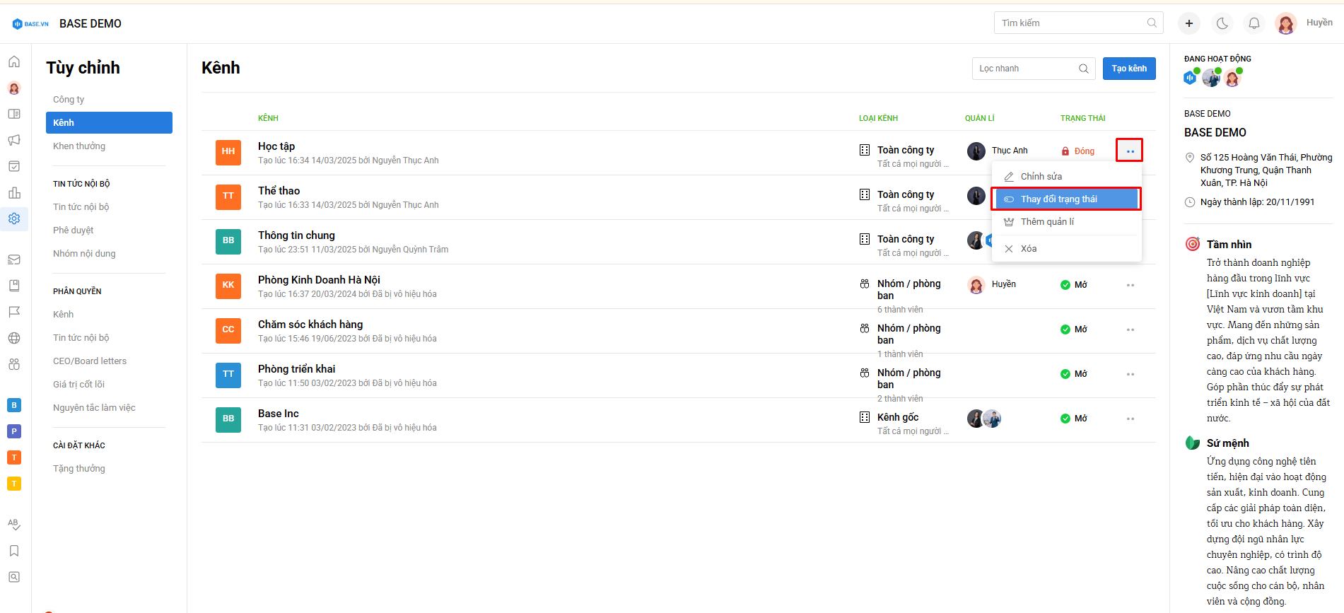 Để thực hiện đóng mở Kênh trên Base Inside bạn thao tác như sau: