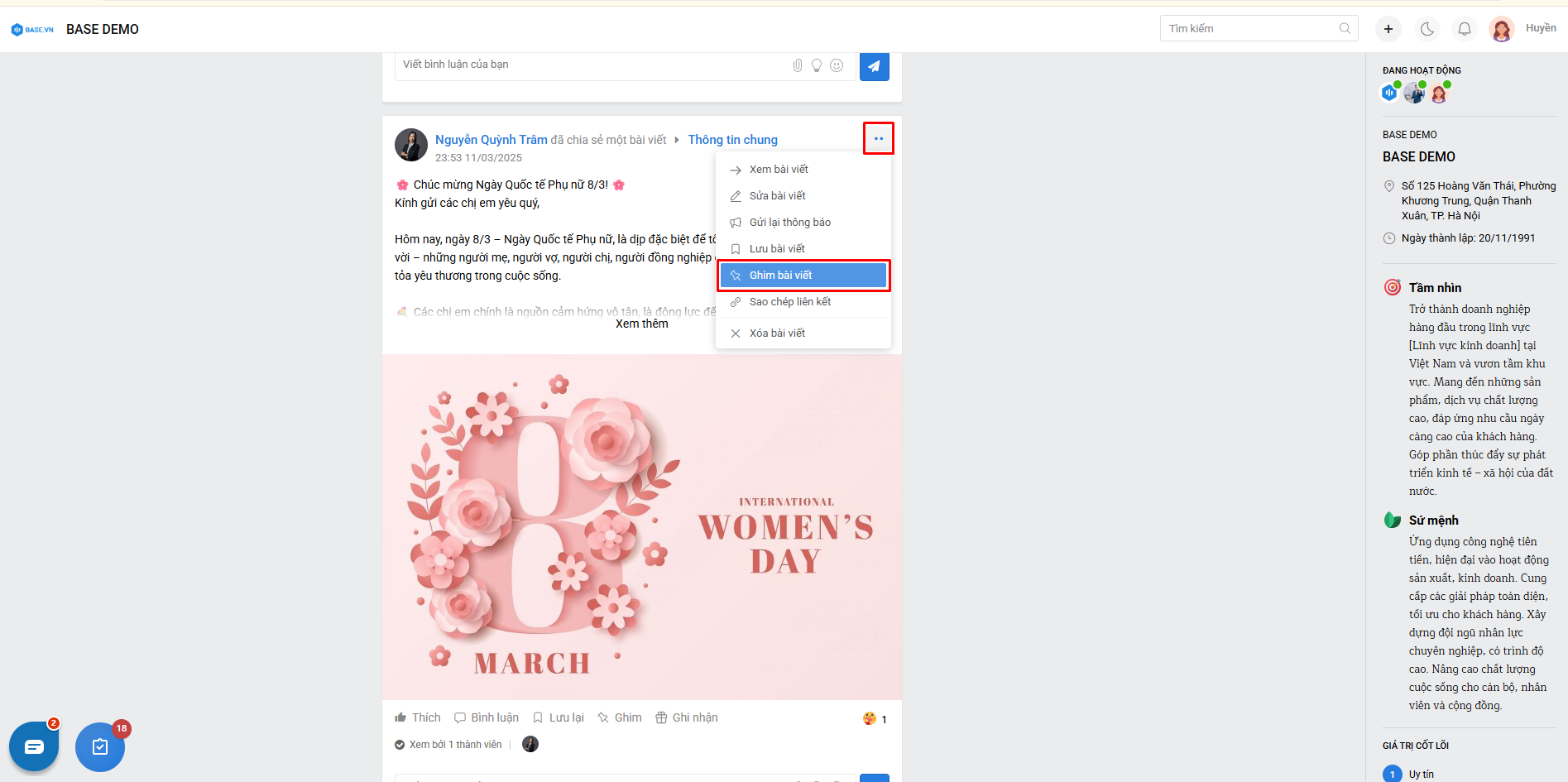 Bước 2: Tại trang Home, ở bài viết muốn đánh dấu click vào mũi tên chỉ xuống > Ghim bài viết