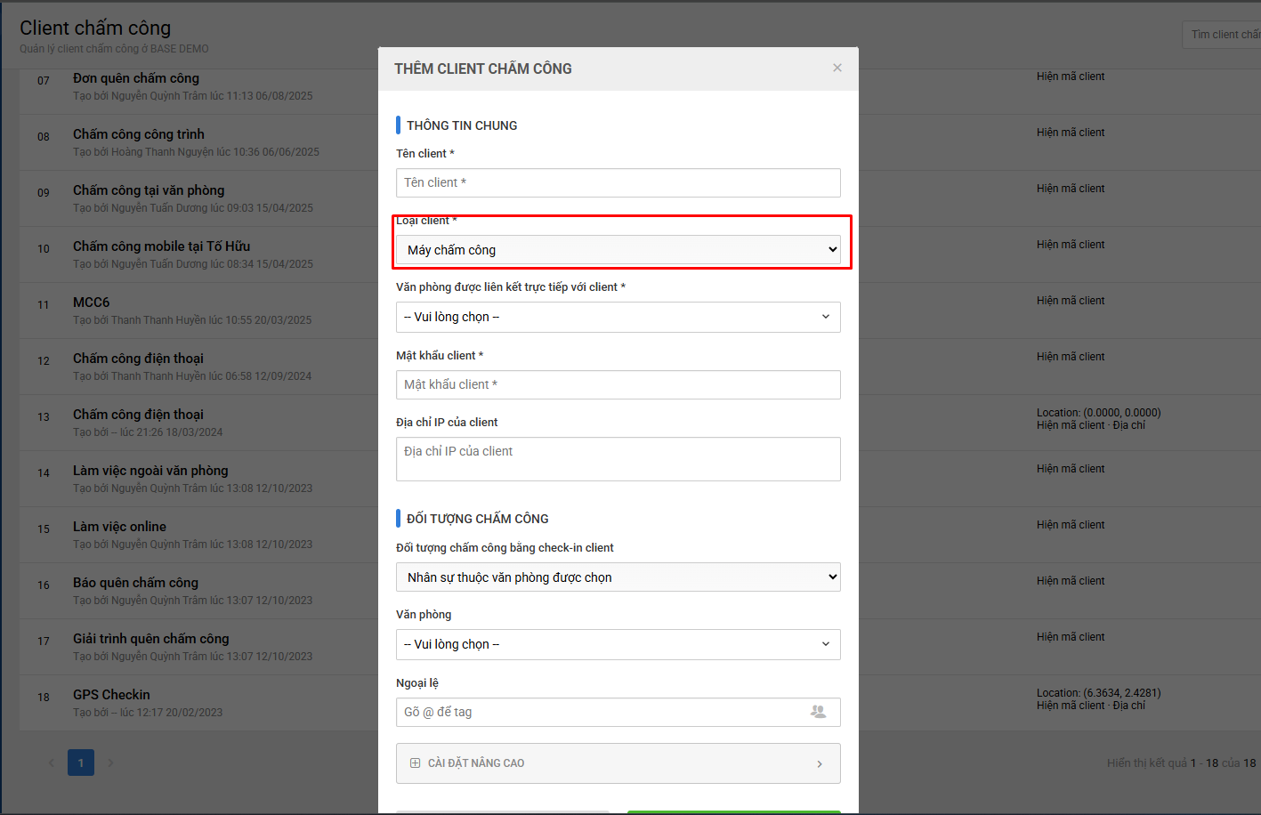 + Loại client: Máy chấm công