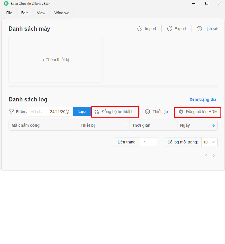 Nhấn Đồng bộ từ thiết bị để lấy dữ liệu từ máy chấm công về Base Check-in Client trước, sau đó Đồng bộ lên HRM để đưa data đó lên Base Checkin