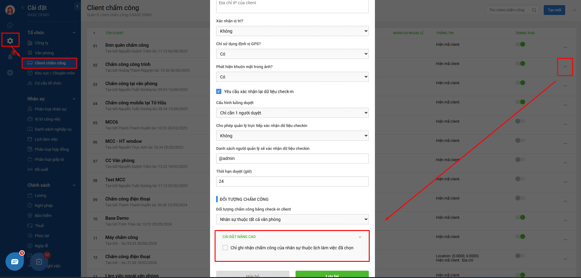+ Trao đổi để Admin HRM thiết lập tắt lựa chọn GPS trong Cài đặt Client