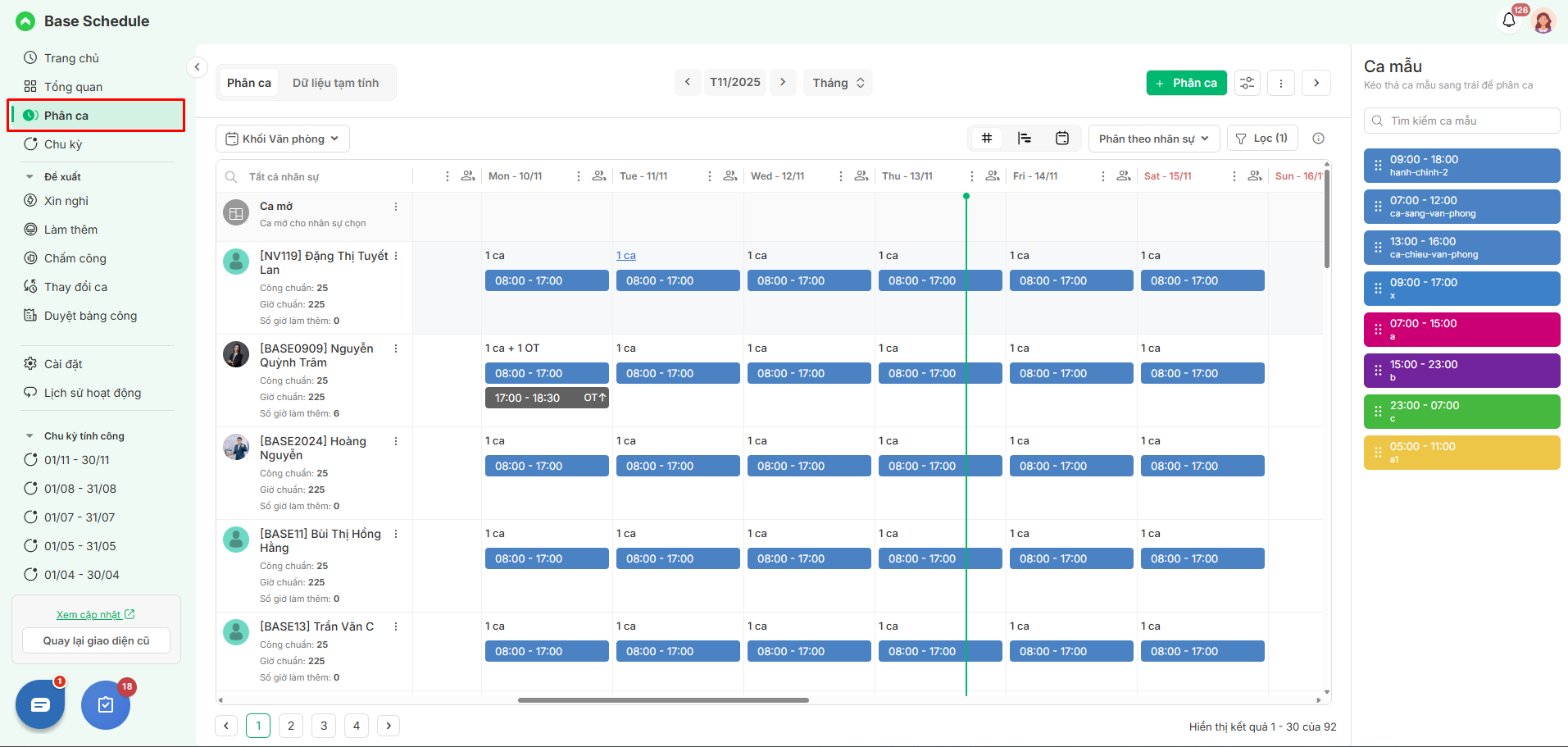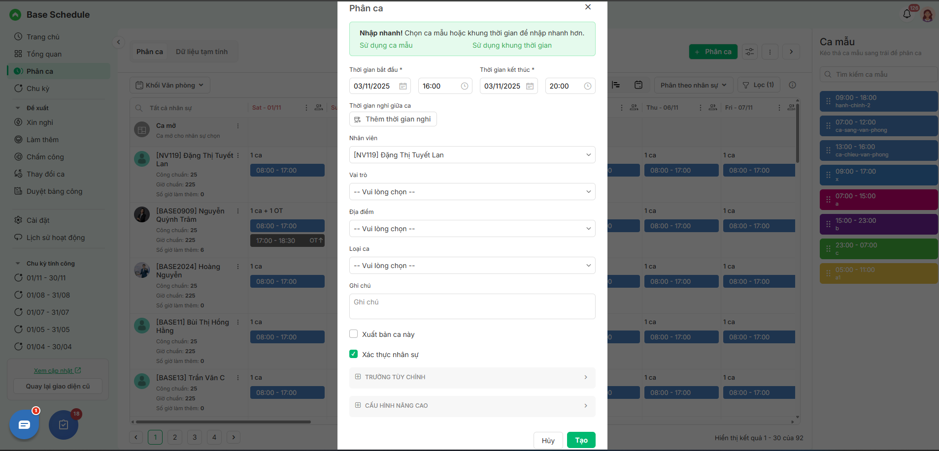 Base Schedule: Phân ca thủ công cho nhân viên in
