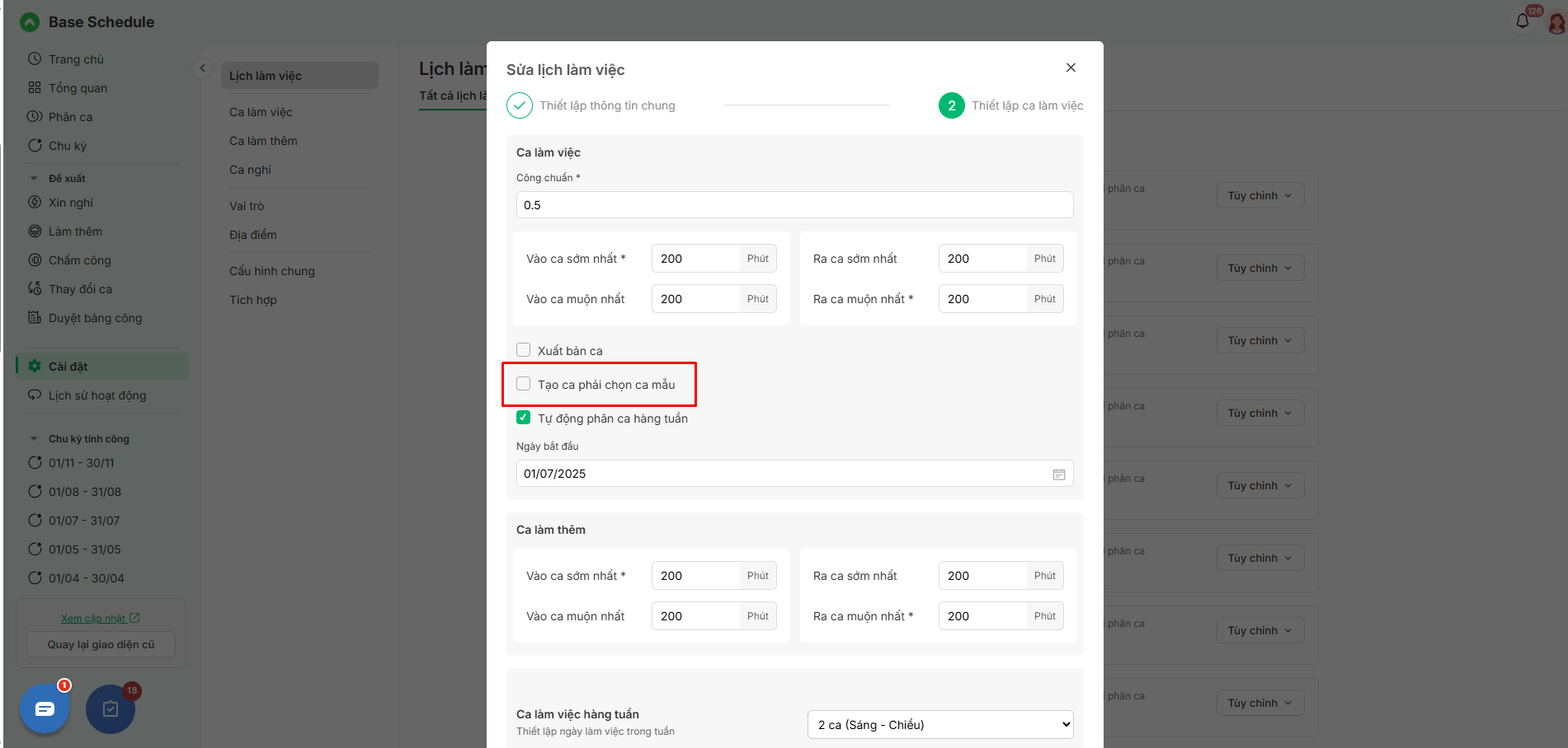 Trường hợp Lịch làm việc này cài đặt Tạo ca phải chọn ca mẫu thì bạn bắt buộc phải chọn ca mẫu tại đây và không tùy chỉnh được thời gian làm việc riêng cho từng ca