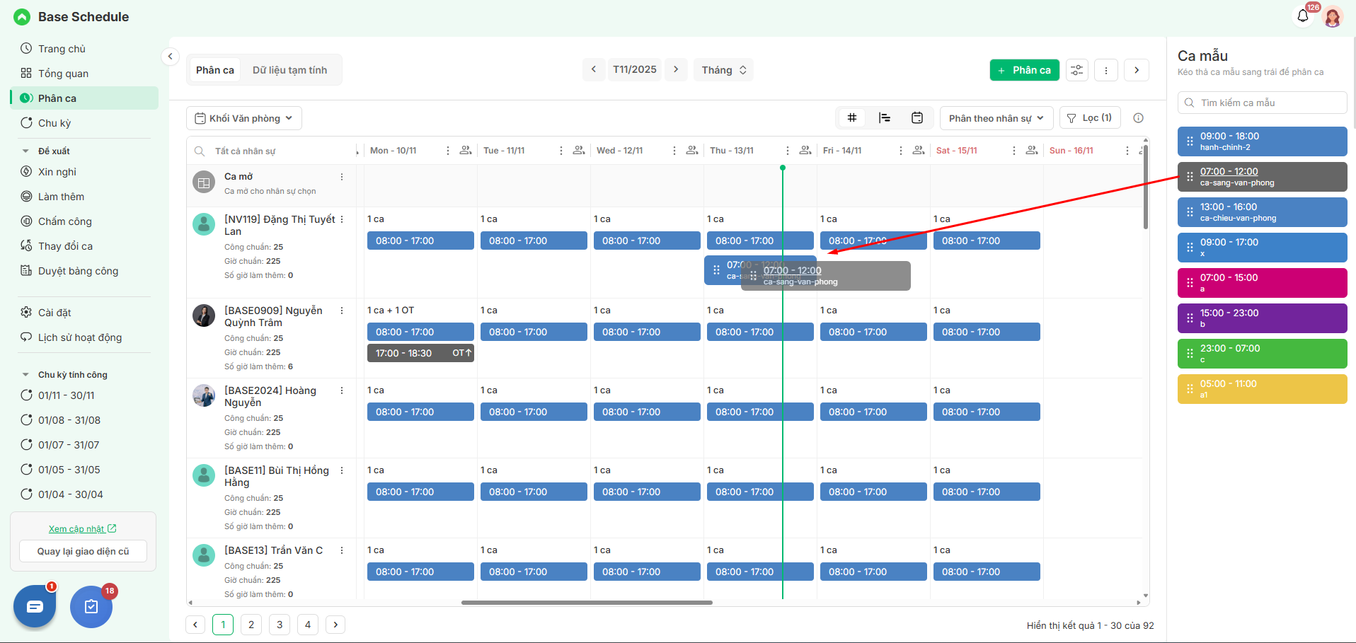 Hoặc nếu bắt buộc sử dụng Ca mẫu hoặc có ca mẫu với khung giờ phù hợp, bạn có thể thực hiện kéo/ thả nhanh ca mẫu vào đúng ngày cần phân ca của nhân sự đó: