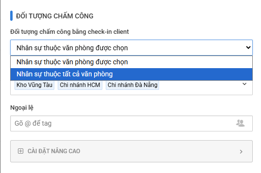 + Nhân sự thuộc văn phòng được chọn: chỉ nhân sự thuộc văn phòng này nhìn thấy và chấm công được. Ngoài ra sẽ có thêm Ngoại lệ để @tag theo từng người/ theo nhóm những nhân sự thuộc văn phòng khác nhưng vẫn chấm công được