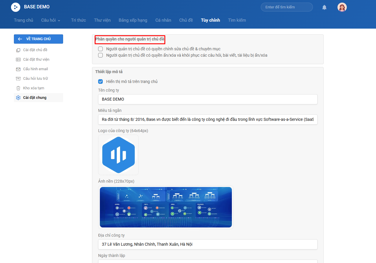 - Người quản trị: tag thành viên quản trị chủ đề - người có thể giải đáp các vấn đề liên quan tới chủ đề. Ngoài ra, có thể phân quyền cho Quản trị chủ đề theo Tùy chỉnh >> Cài đăt chung: