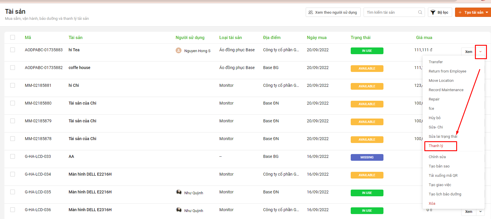 Tại màn hình Tài sản hoặc chi tiết 1 tài sản, di chuột vào mũi tên và chọn Thanh lý