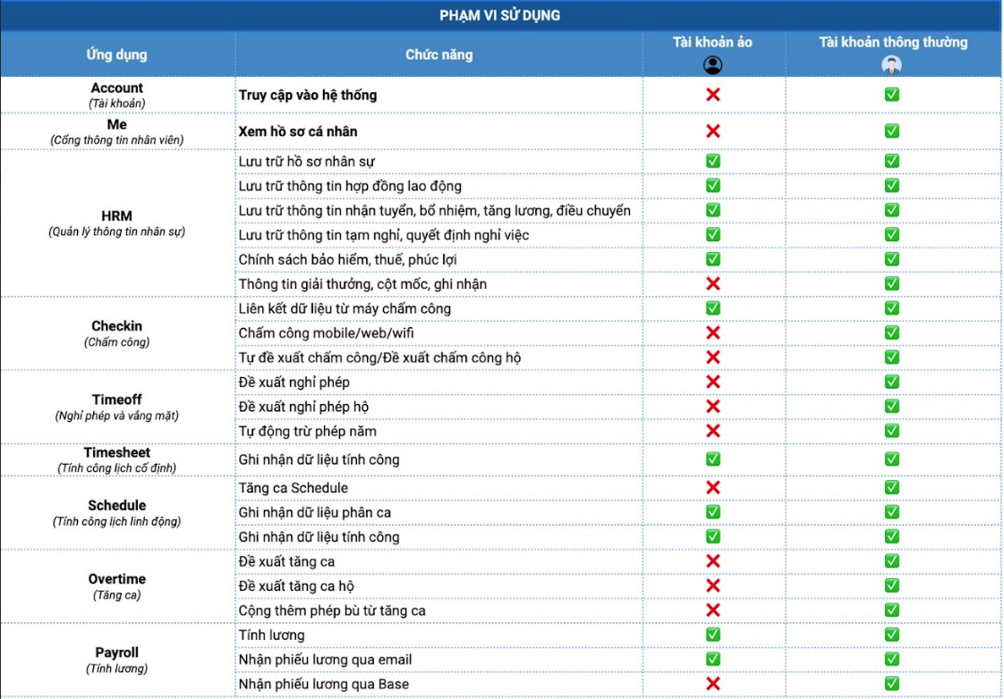 - Sau đây là bảng so sánh những tính năng giữa tài khoản ảo và tài khoản HRM thông thường