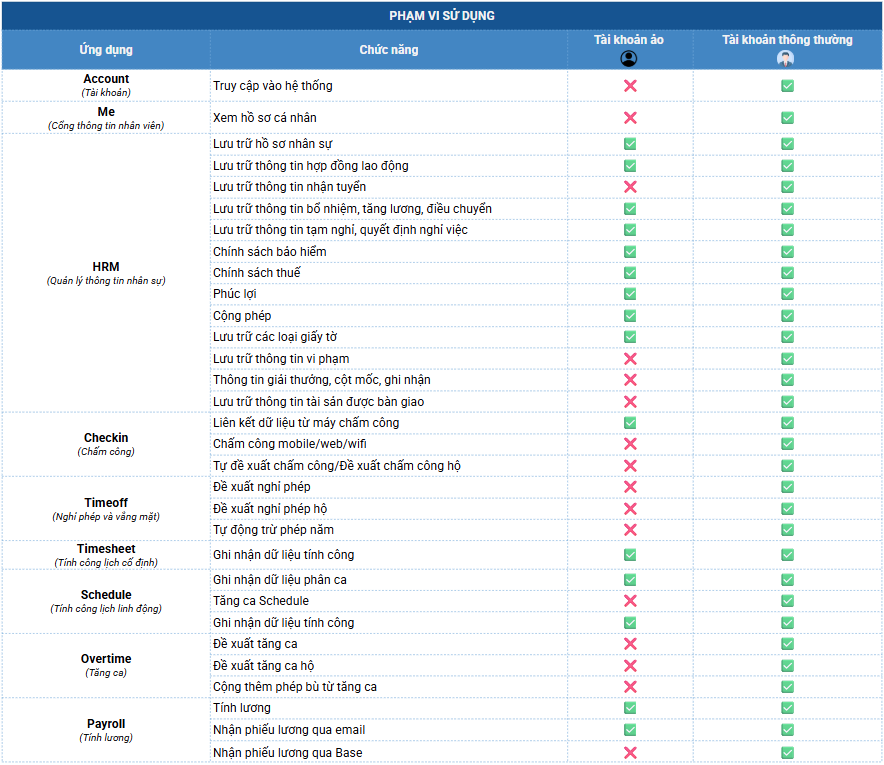 - Sau đây là bảng so sánh những tính năng giữa tài khoản ảo và tài khoản HRM thông thường