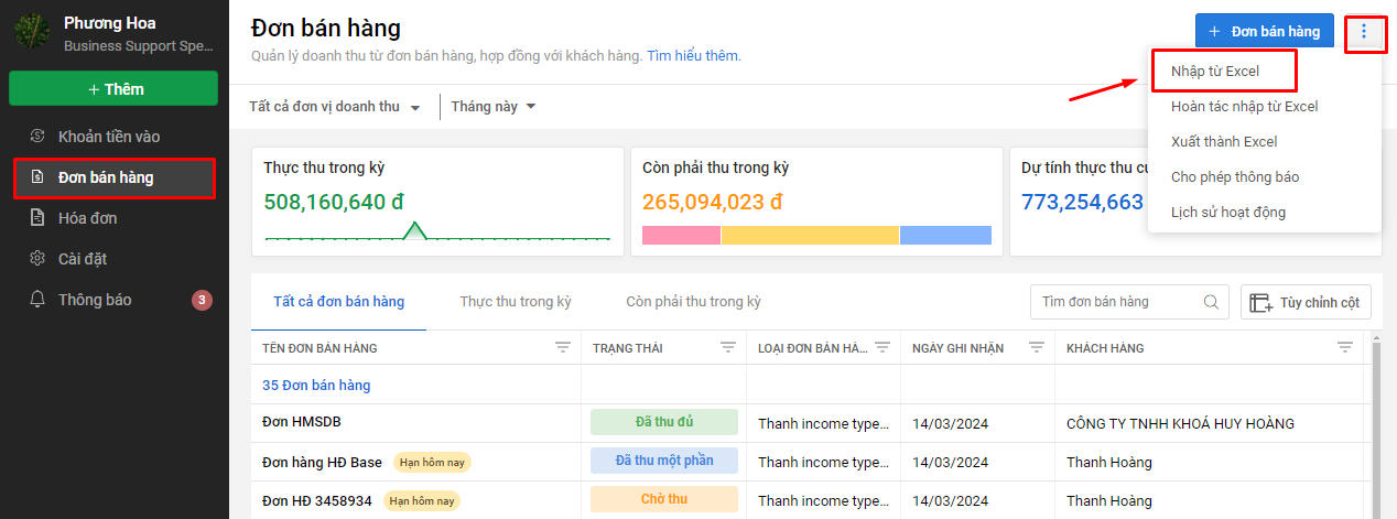 Bước 1: Vào mục "Đơn bán hàng" >> Đưa chuột vào dấu ... ở góc phải màn hình >> Chọn "Nhập từ excel"