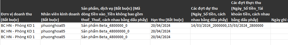 + Để trống cột 10 (Các đợt thực thu) - nếu muốn đơn hàng ở trạng thái Chờ thu.