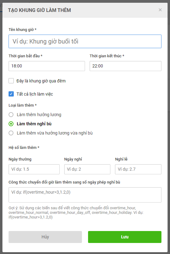 Khung giờ làm thêm giúp bạn thiết lập các thông tin liên quan đến khung giờ nhân viên được phép tăng ca