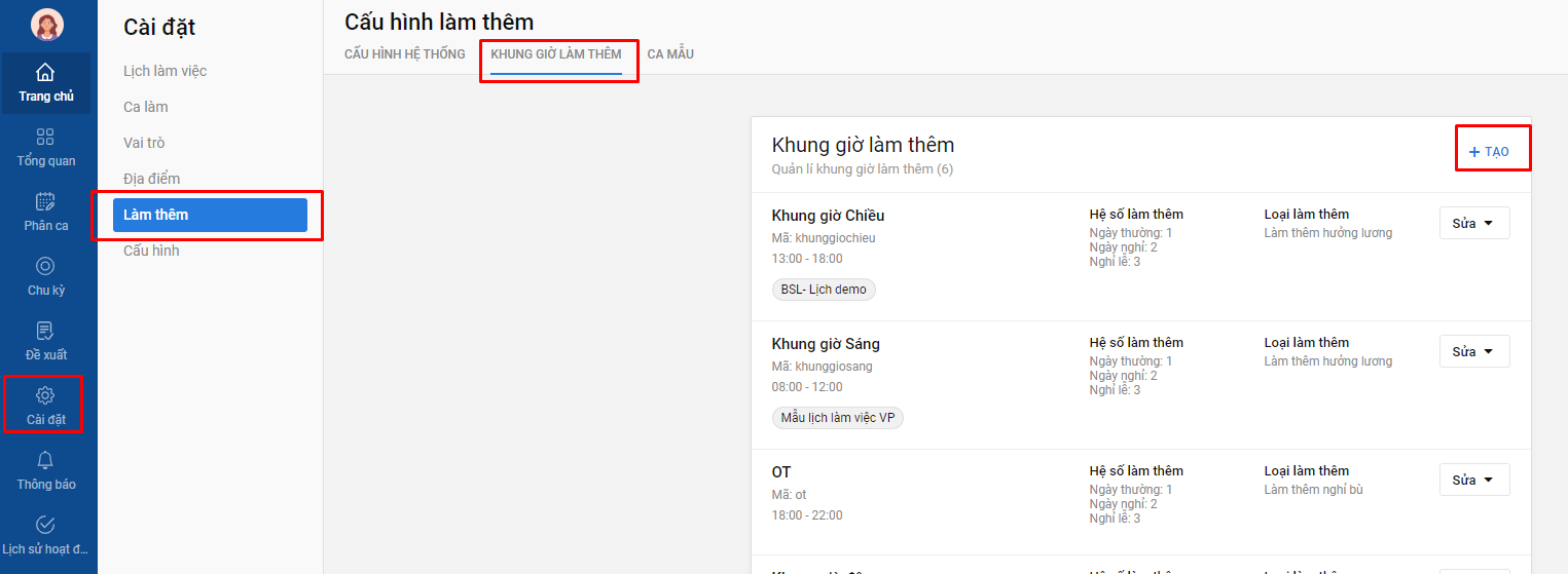 - Bước 1: Chọn Cài đặt > Làm thêm > Khung giờ làm thêm > Chọn Tạo