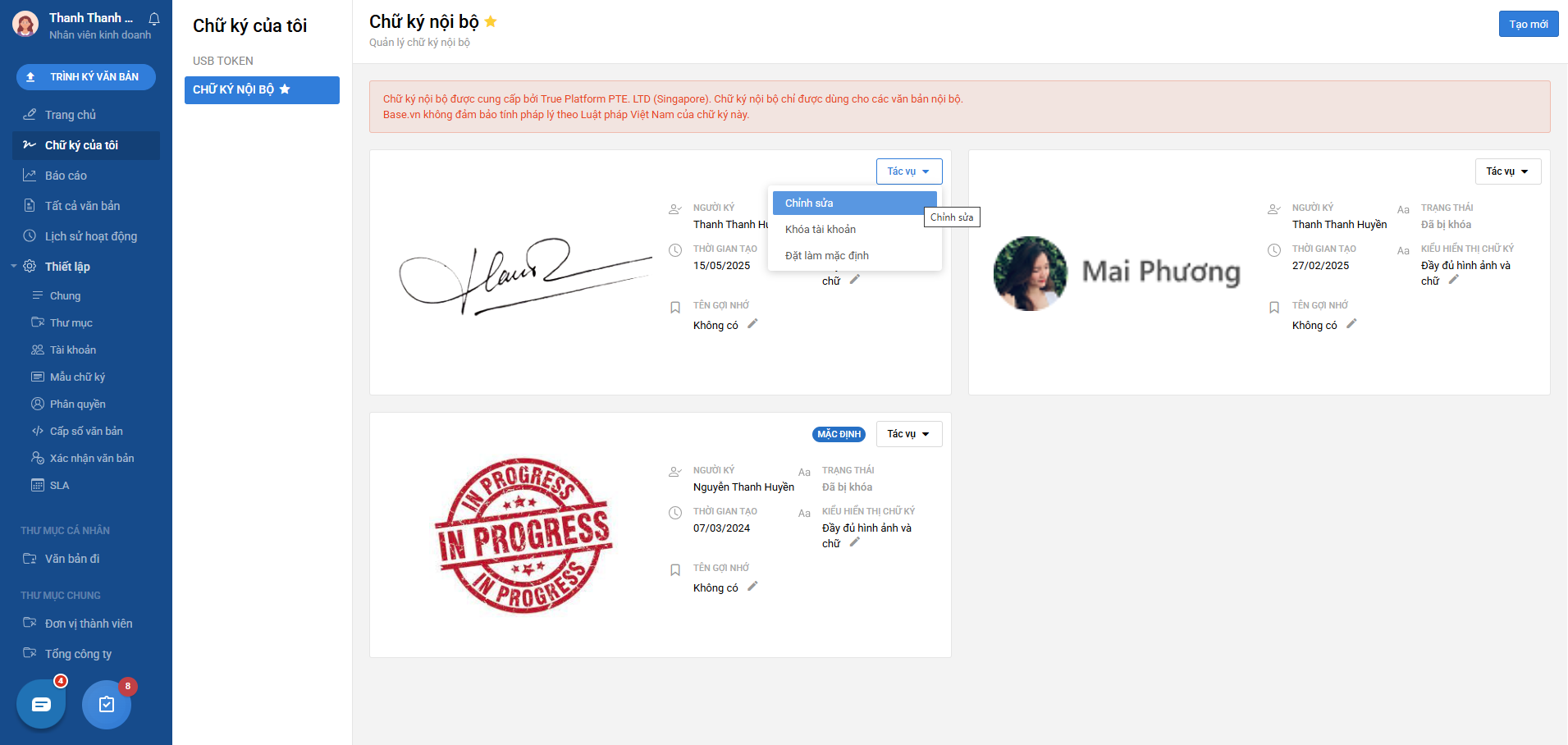 Sau khi tạo xong, bạn cũng có thể click Tác vụ >> Chỉnh sửa để thay đổi hình ảnh chữ ký của mình nếu cần.