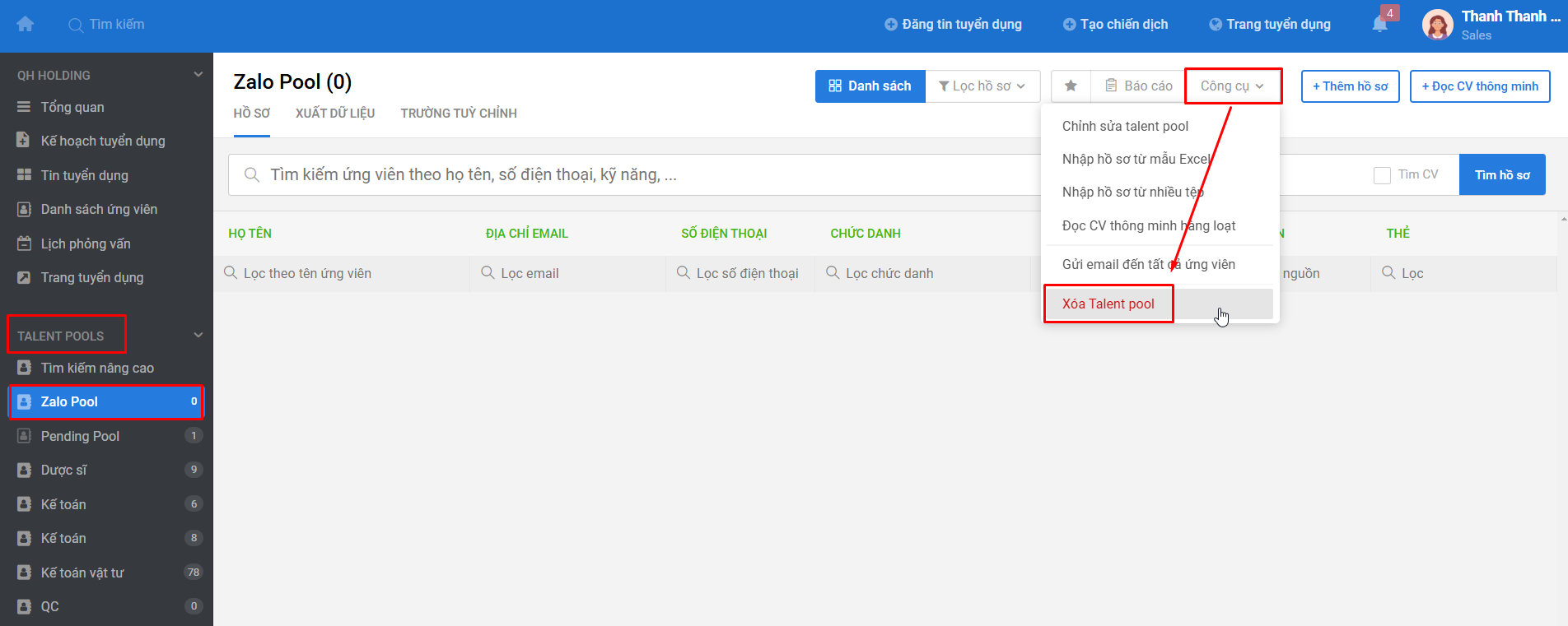 To delete a Talent pool, you need to delete all candidate profiles in that talent pool. If there are still profiles in the pool, the system will report an error and cannot delete them.