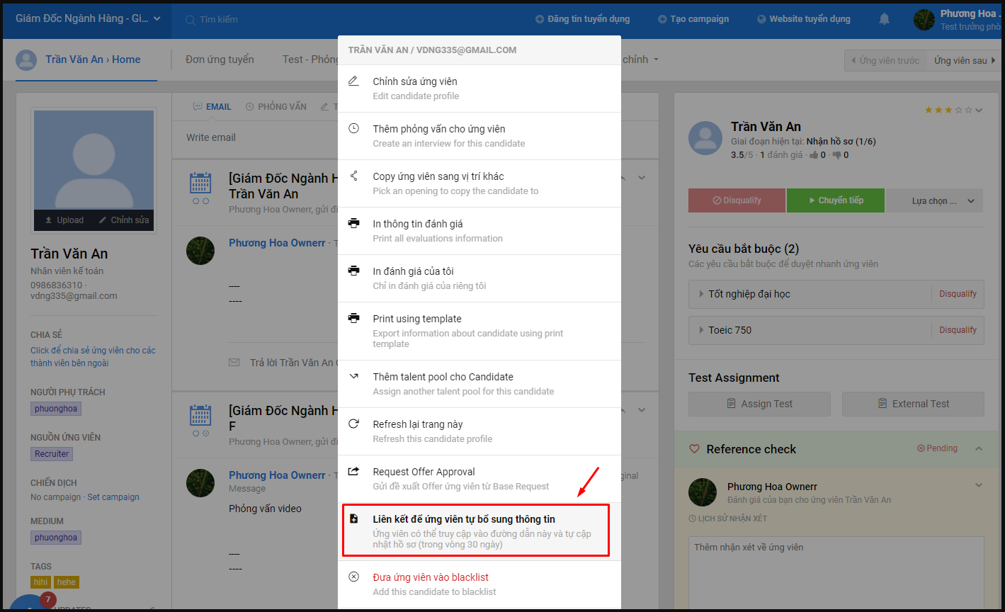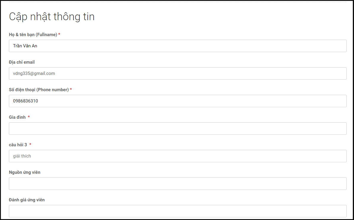 In some cases, when applying, candidates only fill in some basic required information fields, such as: Full name, Email, Phone number, CVs and you need to update full candidate details. You can send candidates additional application links as follows: