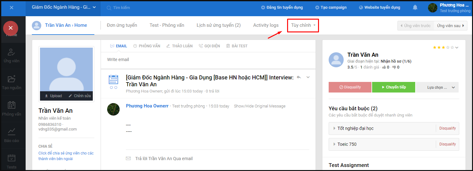 Step 1 : You go to each candidate's details and select " Customize " as shown: