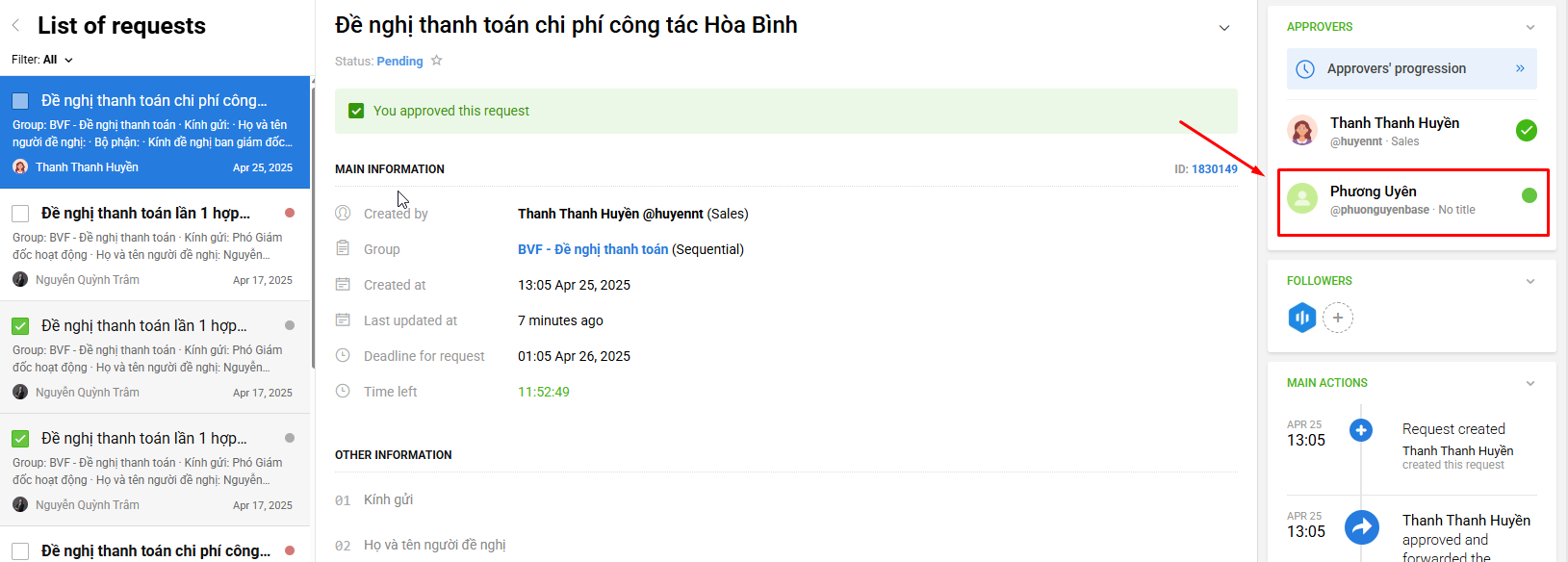To forward a request to another approval - that not join the actual approval progress, go to https://request.base.vn/ or the Base Request icon on the app menu and follow these instructions: