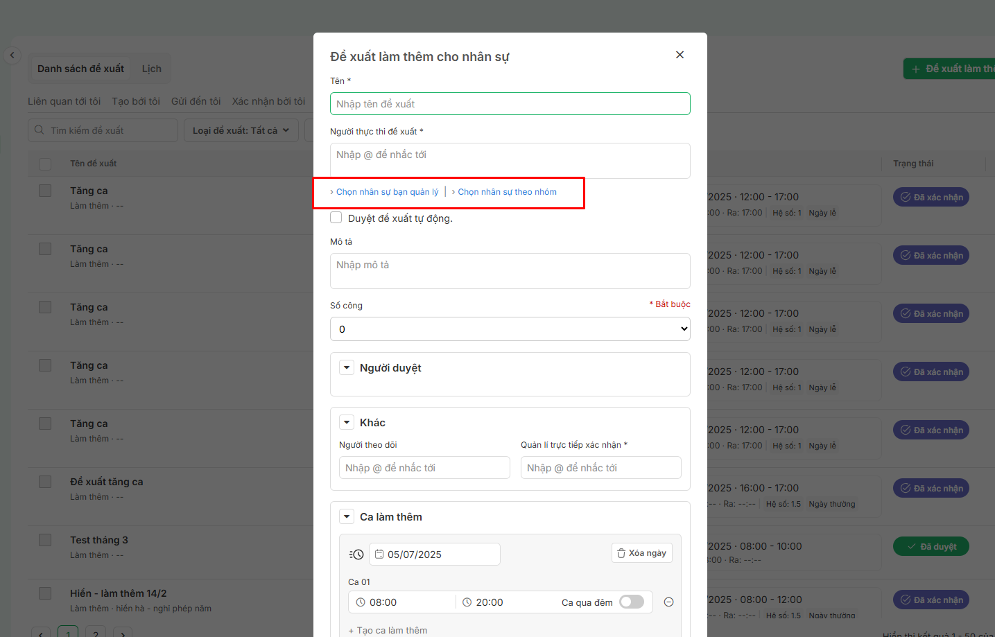 - Người thực thi đề xuất: tag nhân sự muốn cần áp dụng đề xuất tăng ca