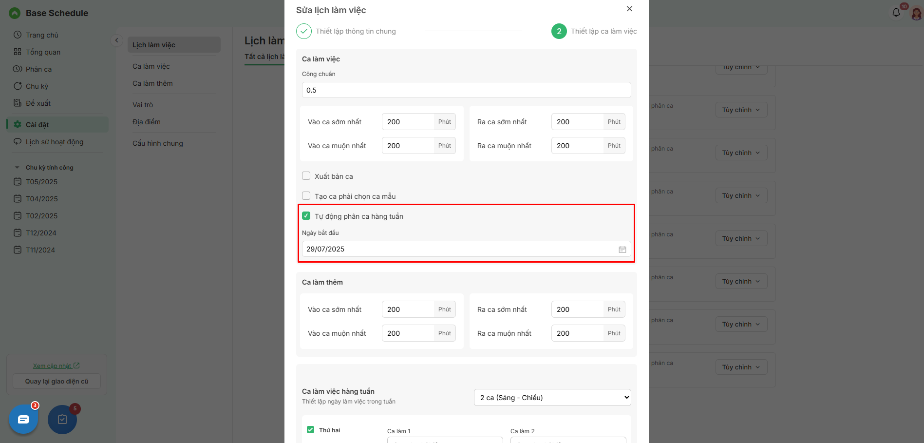 - Trong form tạo hoặc chỉnh sửa Lịch làm việc, khi tick "Tự động phân ca hàng tuần"