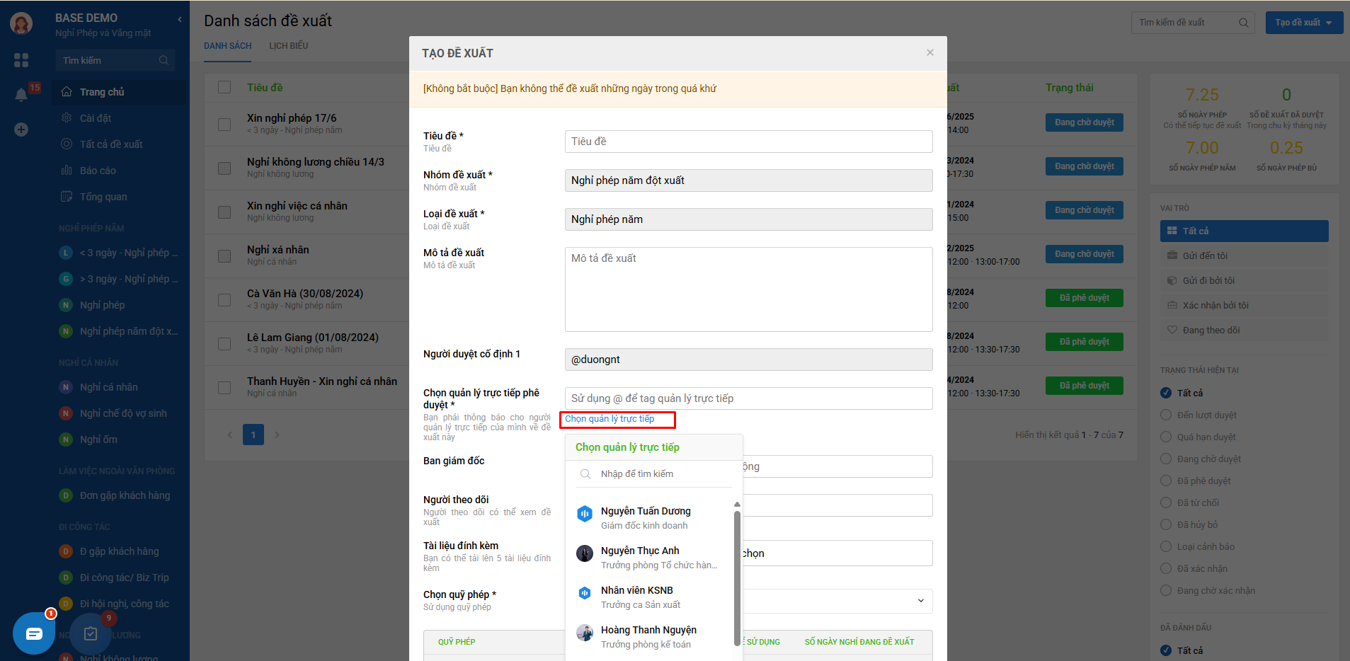 + Nếu "chỉ cho phép chọn quản lý trực tiếp được thiết lập trong Base Account" chọn Có: Người tạo đề xuất chỉ được tag người trong danh sách quản lý trực tiếp đã được thiết lập trên Base Account, không chọn được người khác.