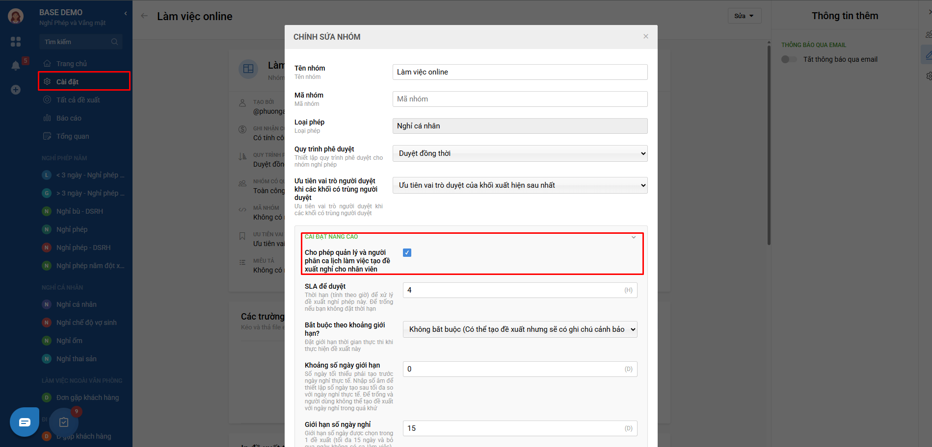- Hoặc bật thiết lập trong từng nhóm timeoff Cho phép quản lý lịch làm việc và người phân ca (trên Schedule) được tạo hộ