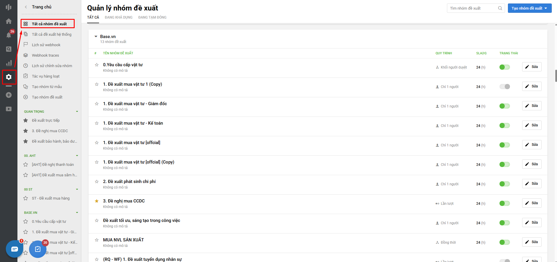 - Bước 1: Bạn truy cập vào https://request.base.vn/ hoặc chọn Base Request trên thanh menu app. Bạn cần có quyền quản trị cấp cao (owner) hoặc quản trị ứng dụng Request để có thể thiết lập được.
