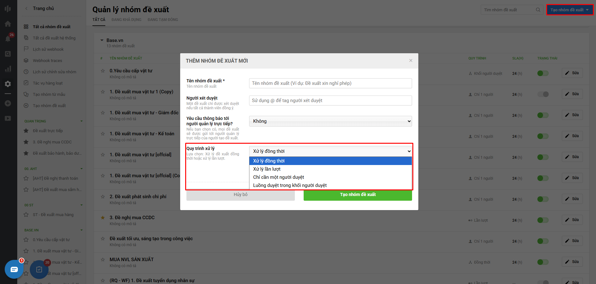 Khi tạo mới form/ nhóm đề xuất, bạn có thể chọn Luồng duyệt trong khối người duyệt tại Quy trình xử lý