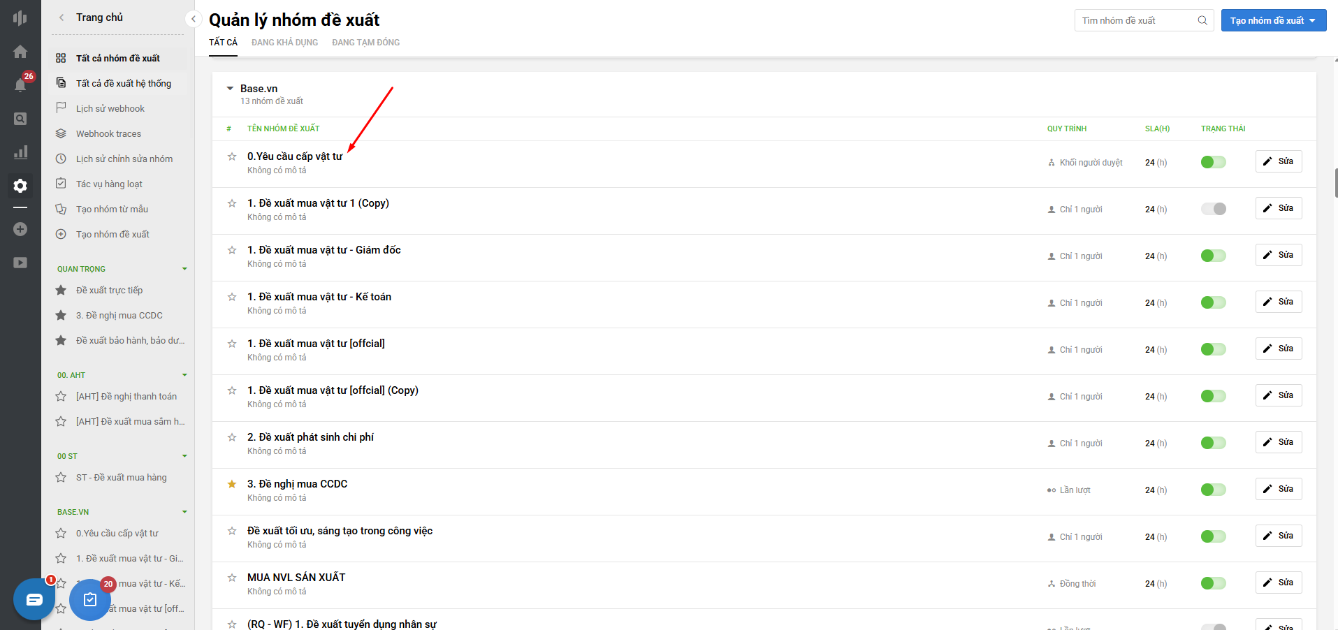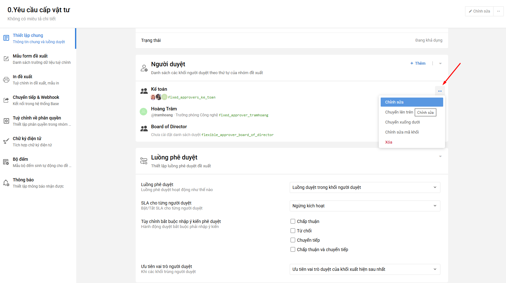 Với form/ nhóm đề xuất cũ, trường hợp cần thay đổi luồng duyệt, bạn click vào tên nhóm đề xuất để chỉnh sửa. Tại Luồng duyệt, click chọn Luồng duyệt trong khối người duyệt