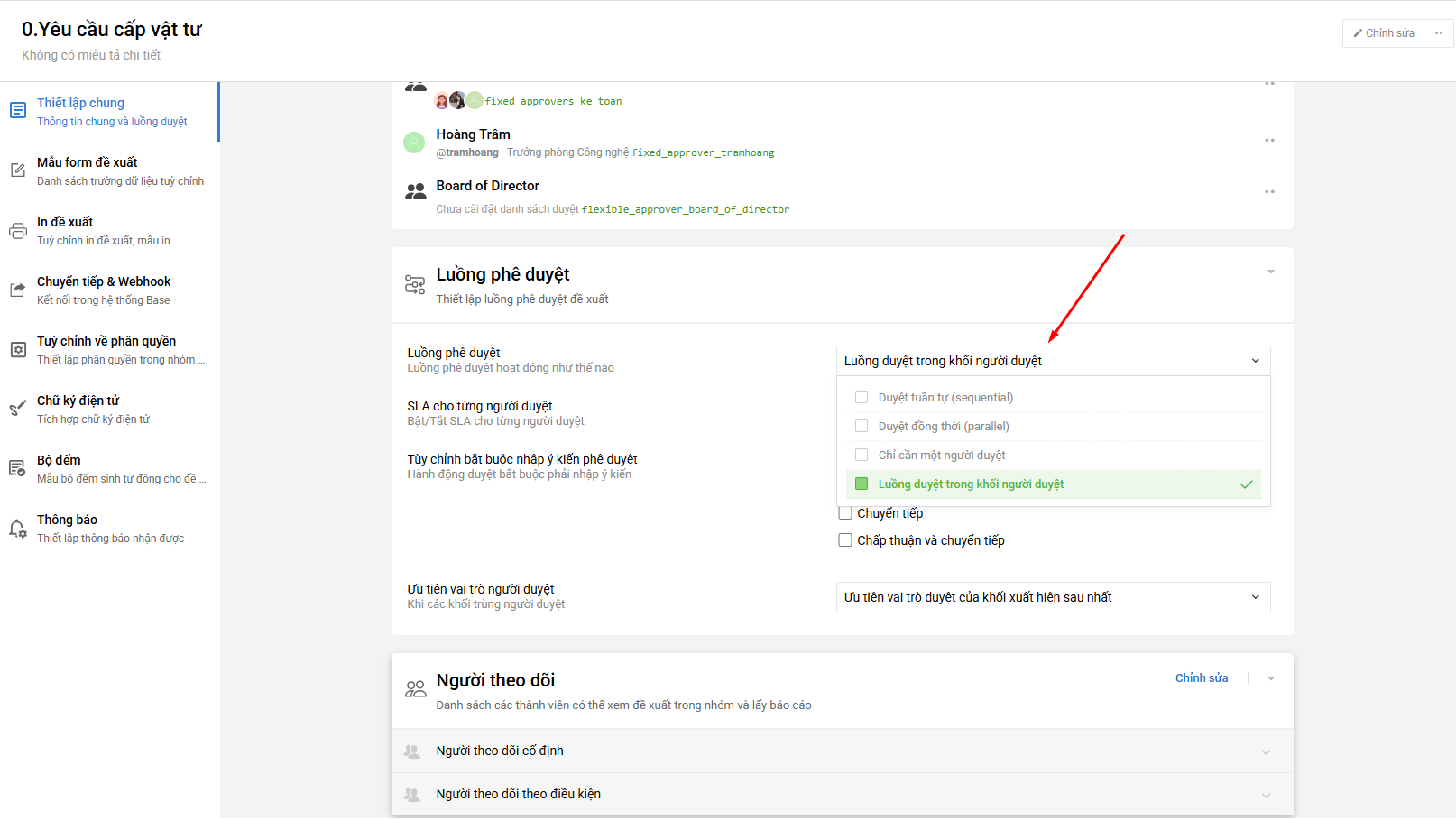 - Bước 4: Sau khi lựa chọn duyệt theo từng khối duyệt, với những khối có từ 2 người duyệt trở lên, bạn cần thiết lập luồng duyệt cho từng khối.