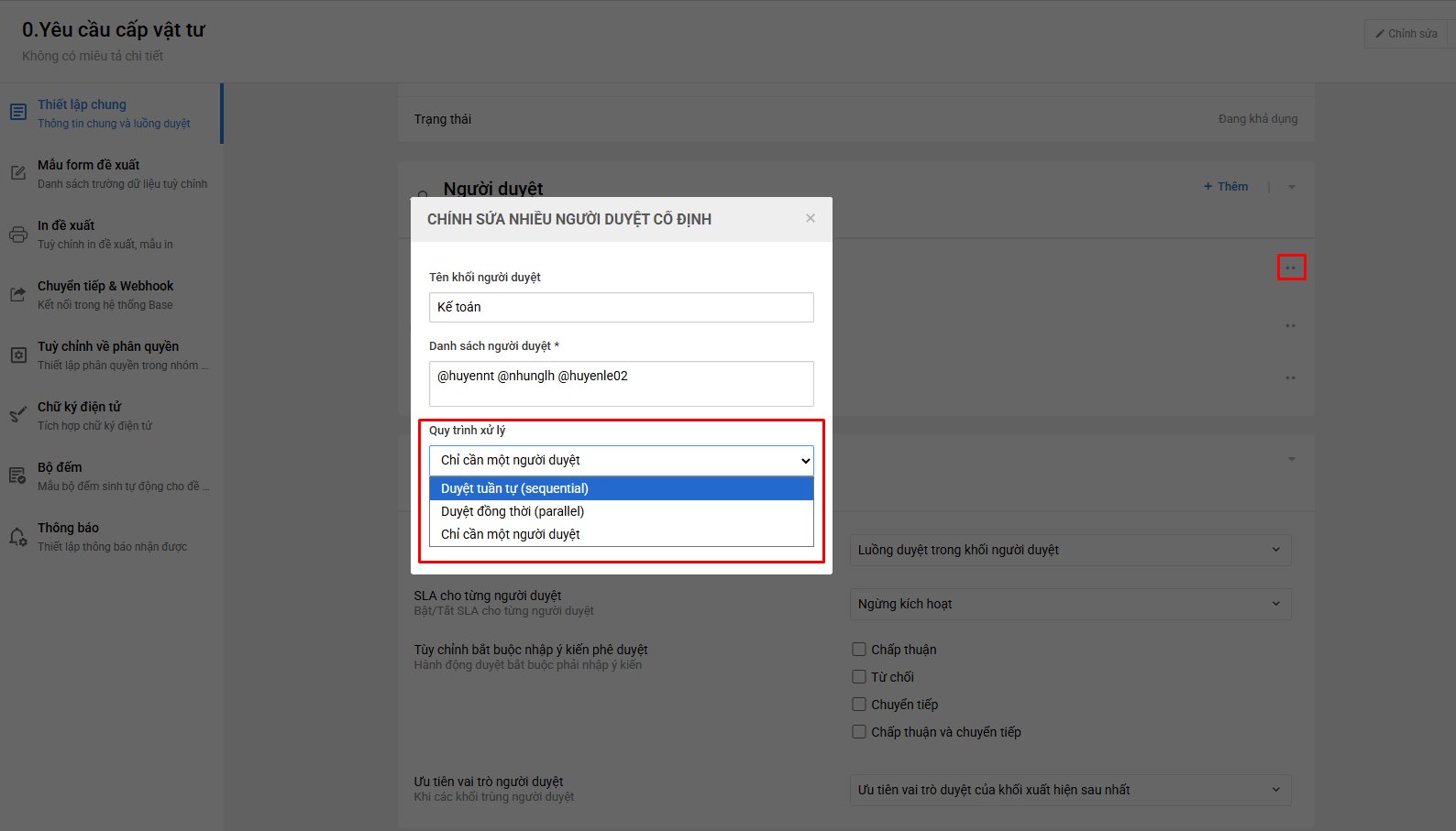 Với những form đề xuất cần kết hợp các luồng duyệt lần lượt, đồng thời hoặc chỉ cần 1 người duyệt trong 1 đề xuất, bạn có thể thiết lập từng luồng duyệt cho từng khối duyệt. (VD khối duyệt Kế toán có 3 người, chỉ cần 1 trong 3 người duyệt, sau đó sẽ chuyển sang BGĐ duyệt)