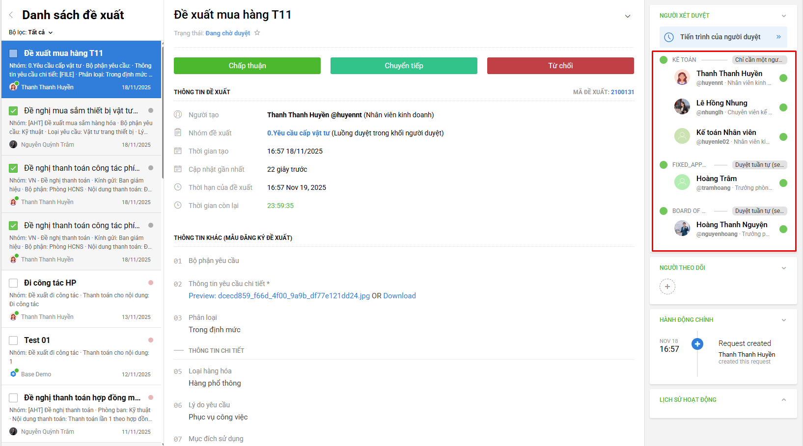 + Khi 1 người trong khối Từ chối (người duyệt cùng khối hoặc khác khối) thì đề xuất sẽ chuyển trạng thái Từ chối, không ai duyệt nữa.