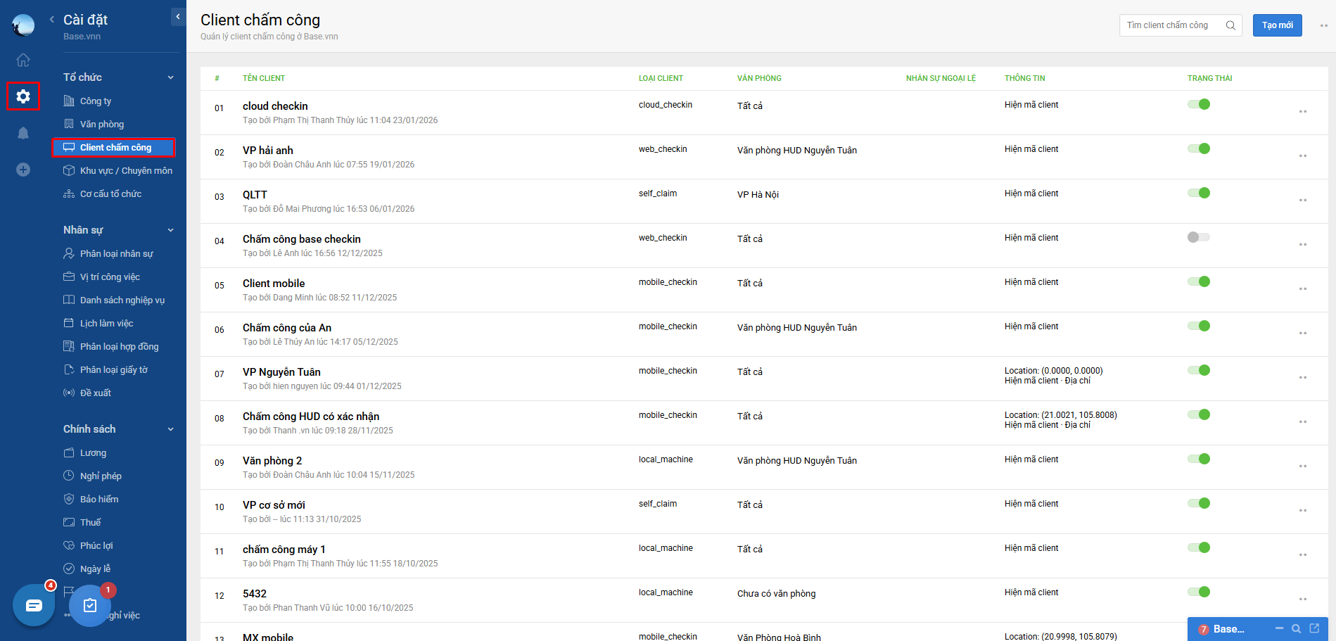 Quản trị cấp cao (Owner) hoặc Quản trị ứng dụng HRM (app admin) cần cài đặt hình thức chấm công này trong app Base HRM.