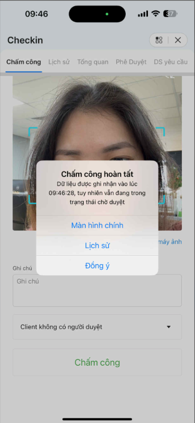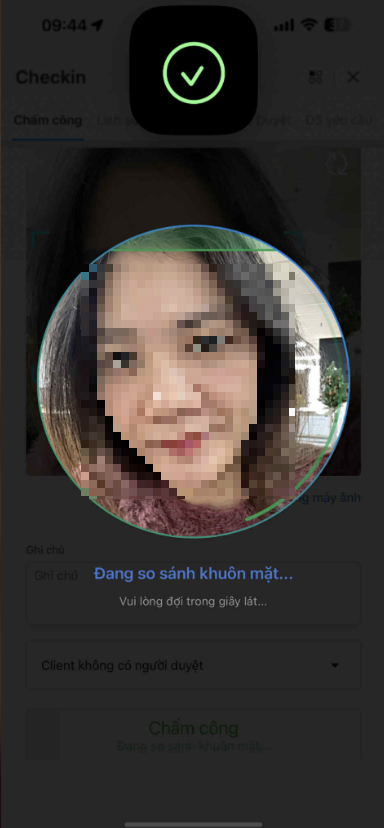 + Nếu thành công, tiếp tục quy trình chấm công và có thông báo ghi nhận dữ liệu chấm công.