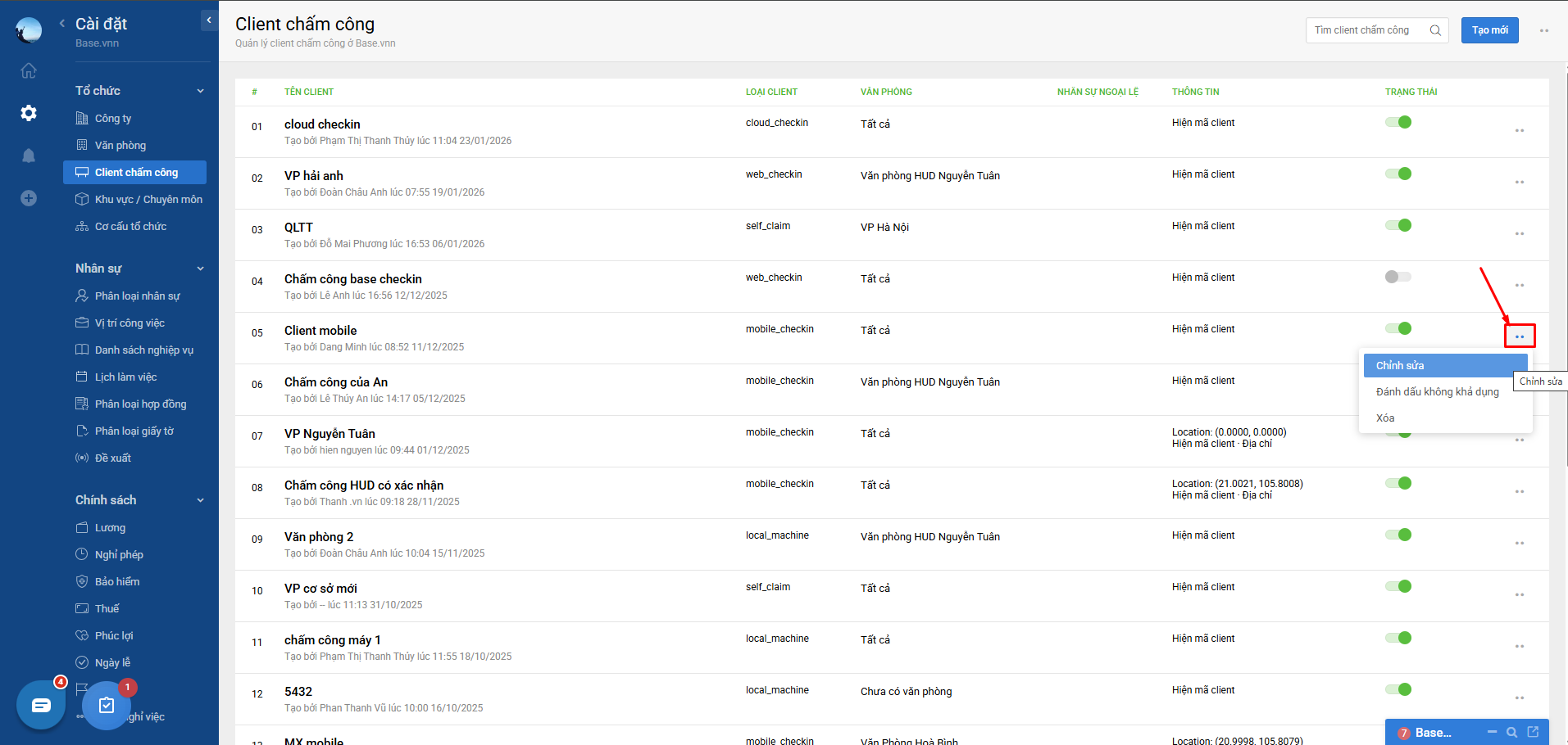 Quản trị cấp cao (Owner) hoặc Quản trị ứng dụng HRM (app admin) cần cài đặt hình thức chấm công này trong app Base HRM.