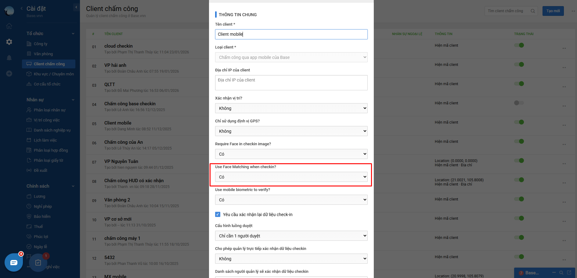 1. Cài đặt cho phép chấm công mobile bằng hình thức Face Matching