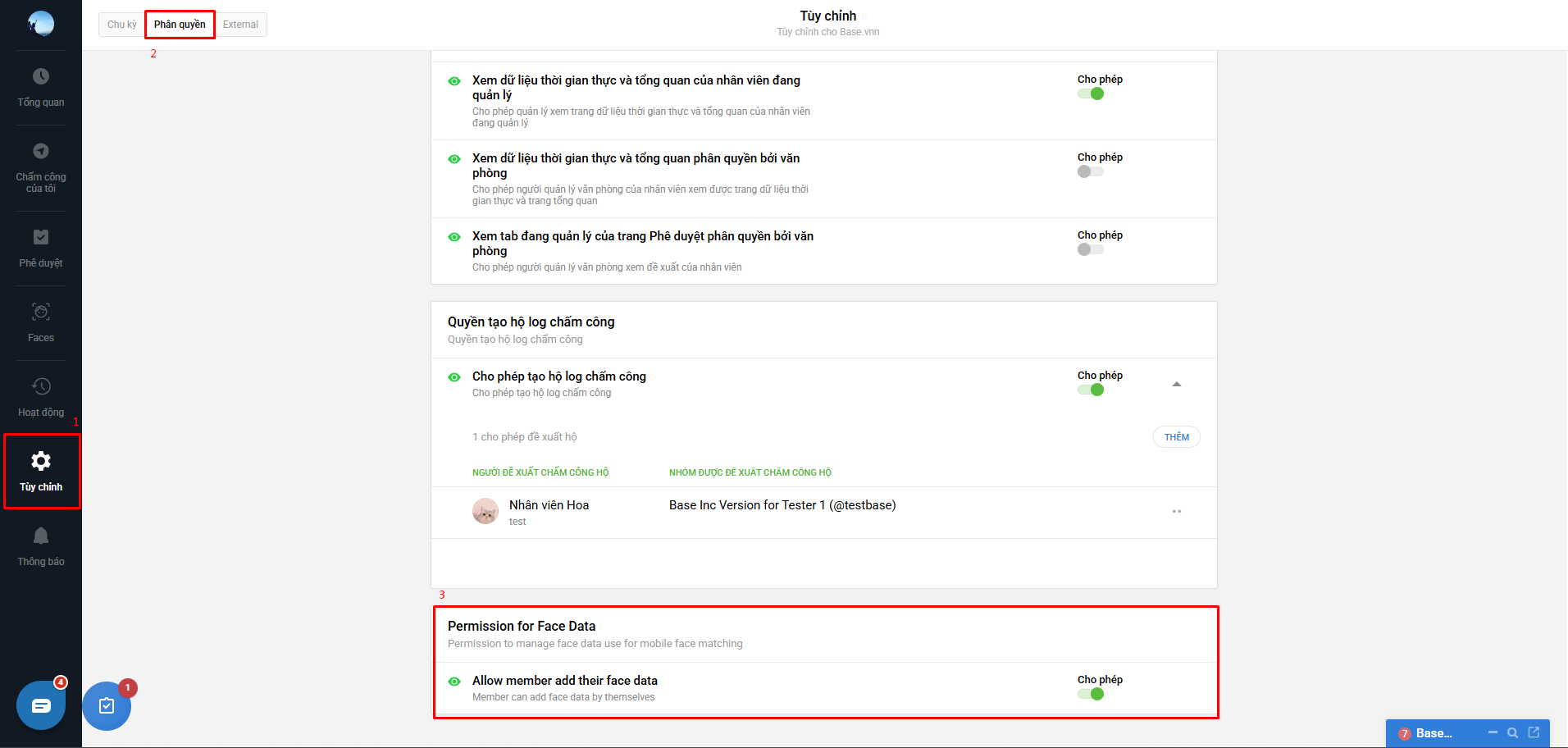 Quản trị cấp cao (Owner) hoặc Quản trị ứng dụng Checkin (app admin) cần cài đặt tại Tùy chỉnh >> Phân quyền >> Permission for Face Data:
