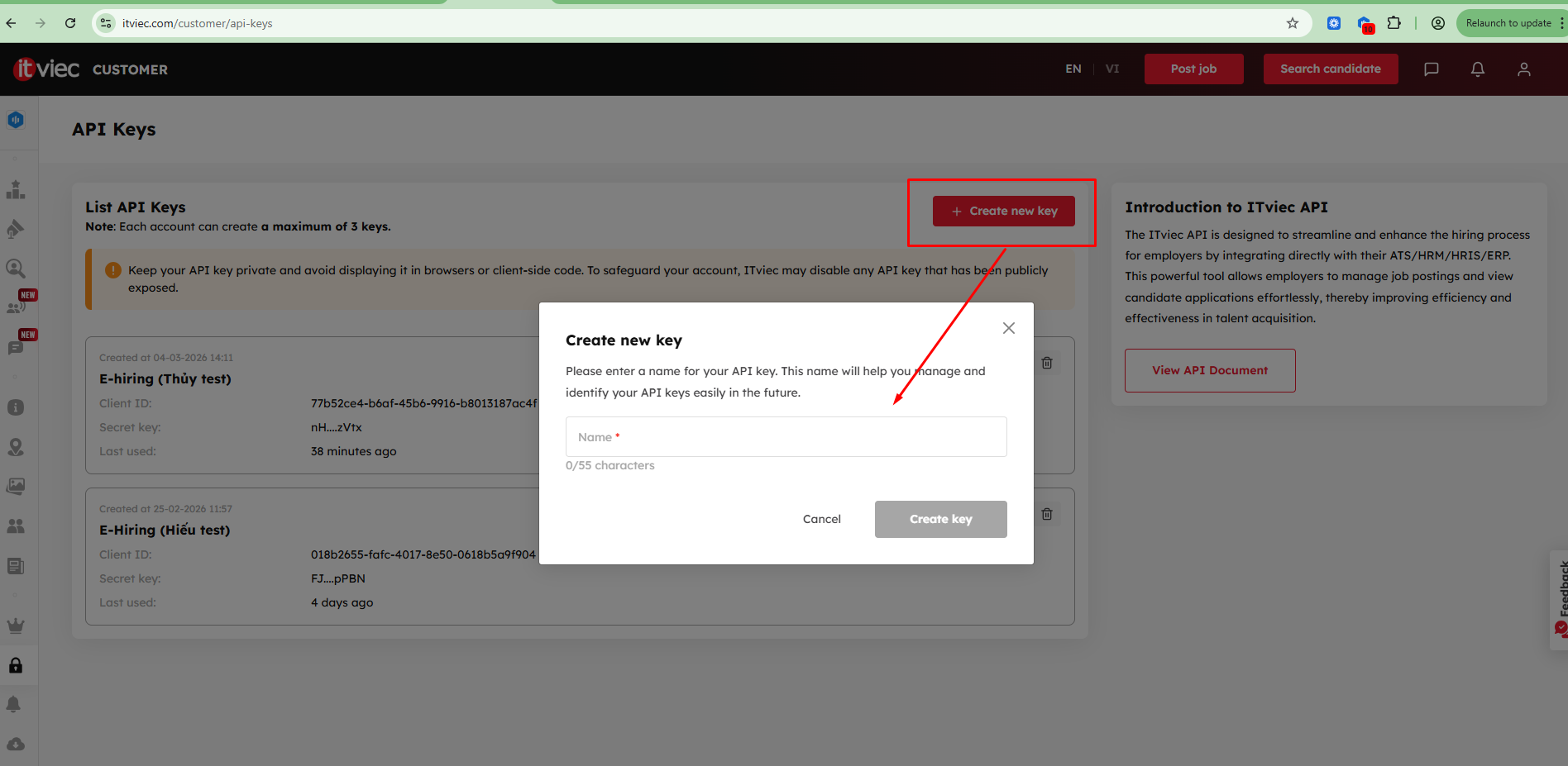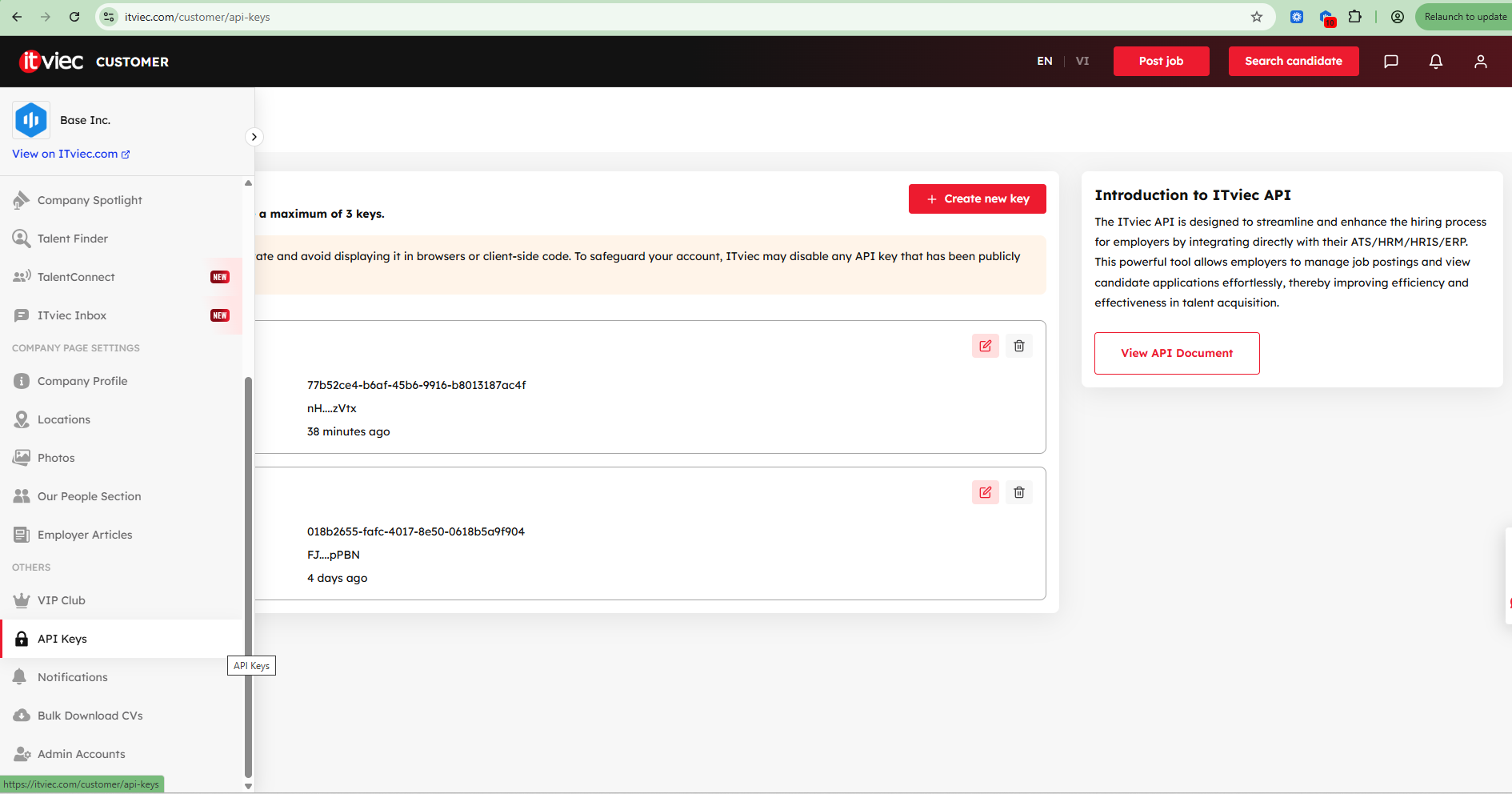 Tại website của ITviec truy cập vào màn API Keys: https://itviec.com/customer/api-keys