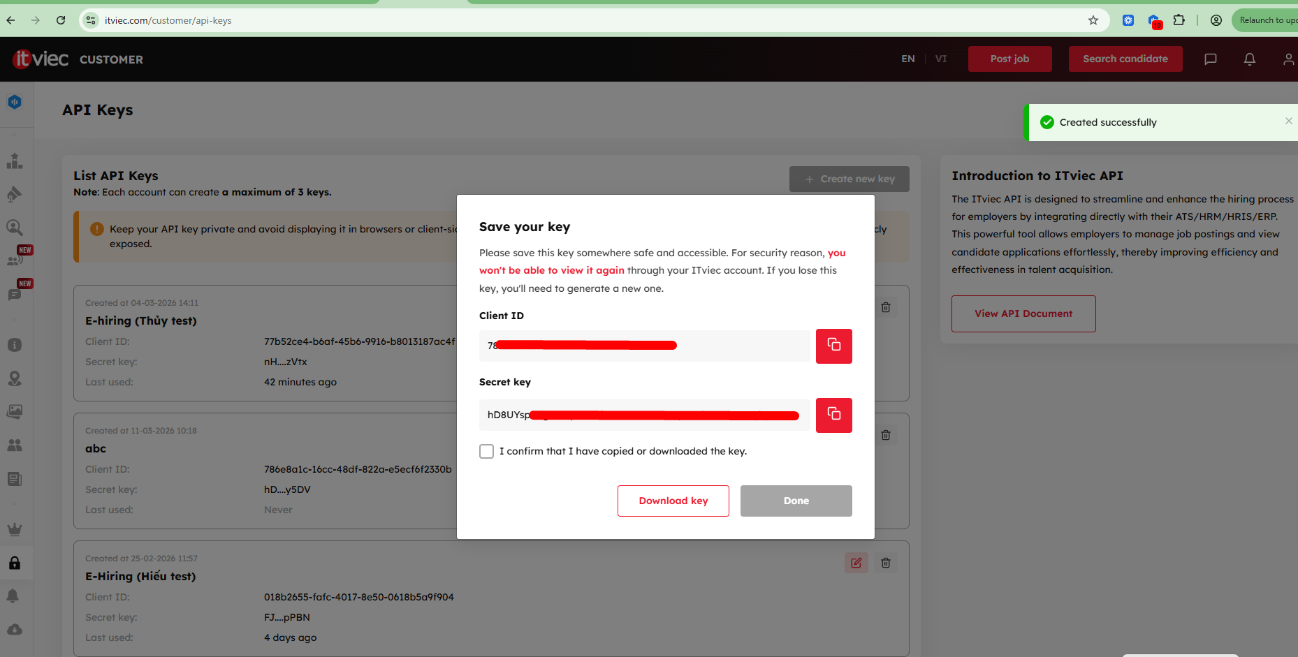 - ITviec sẽ sinh cho nhà tuyển dụng một bộ key bao gồm: Client ID và secret key.