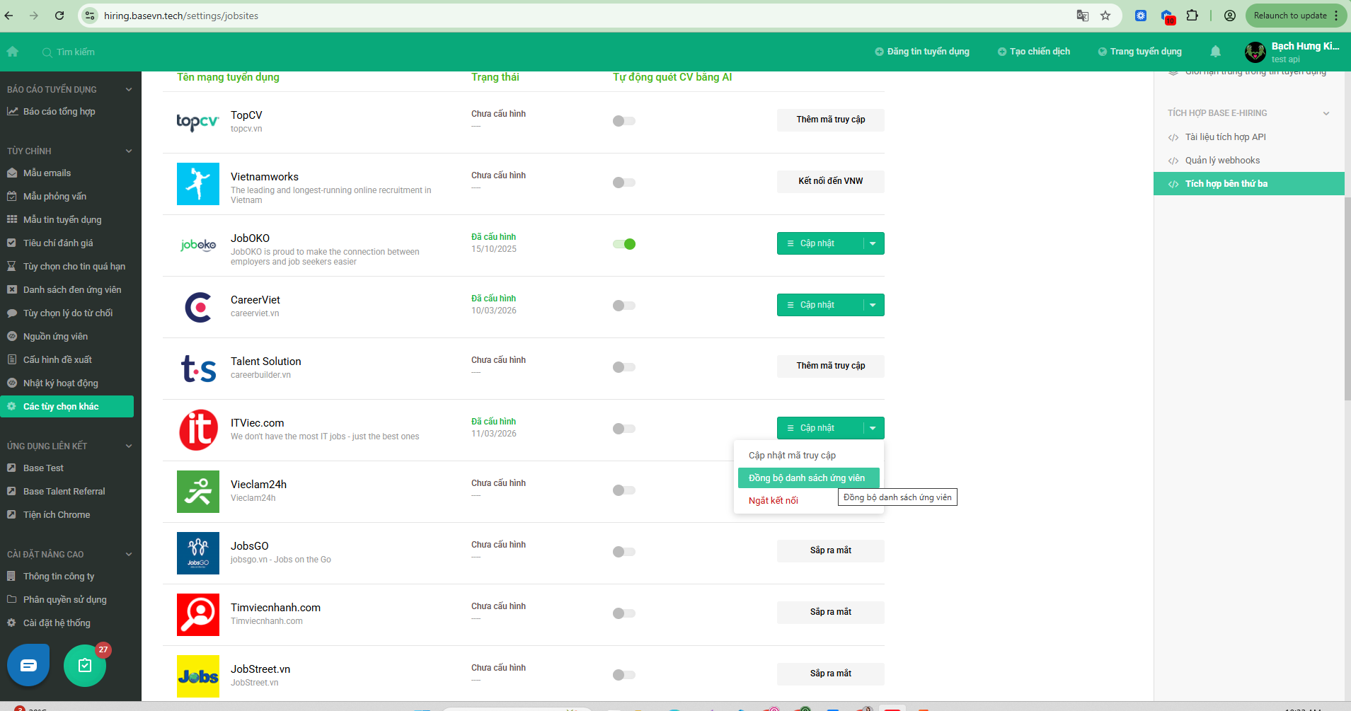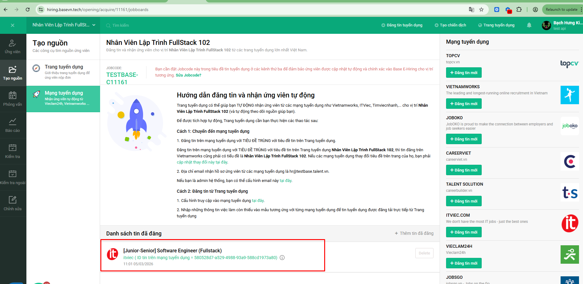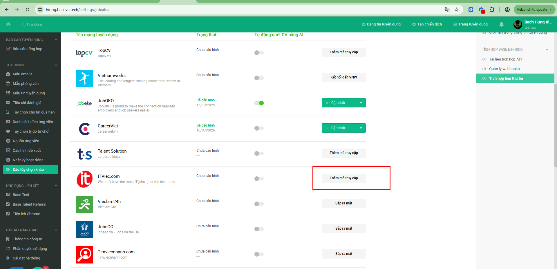 Base E-Hiring: Cách kết nối với jobsite ITviec qua API in