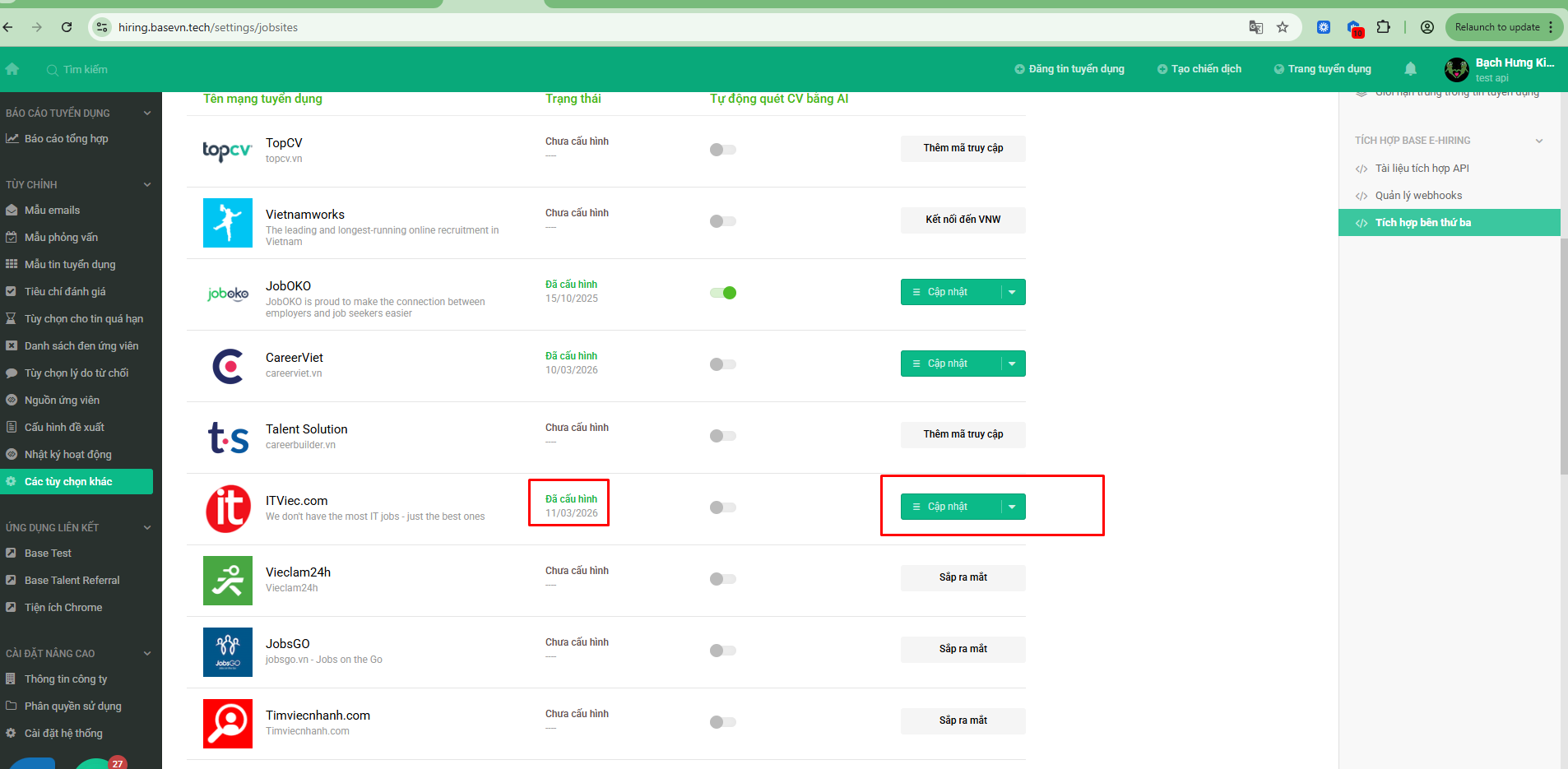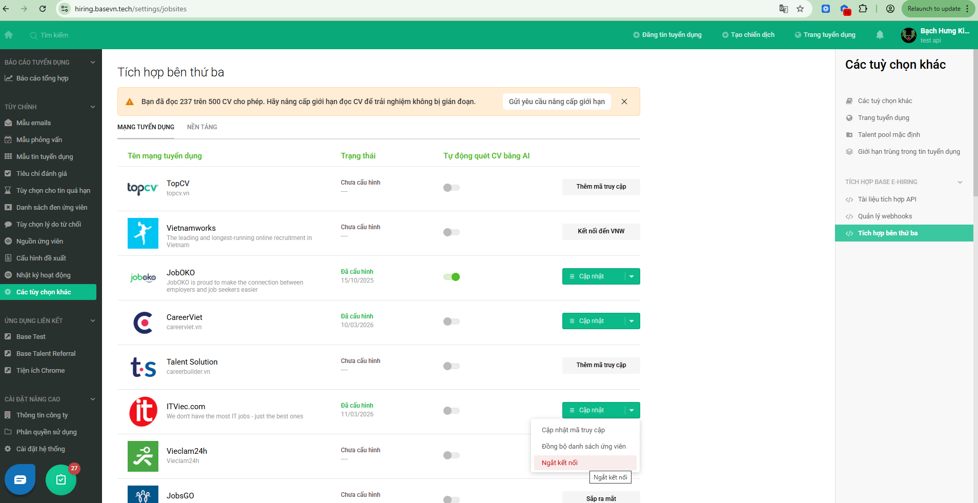 Lưu ý: Khi người dùng muốn ngưng kết nối Base E-Hiring và ITviec, chọn Ngắt kết nối và trạng thái của ITviec trên Base E-Hiring trở về ban đầu là Chưa cấu hình.