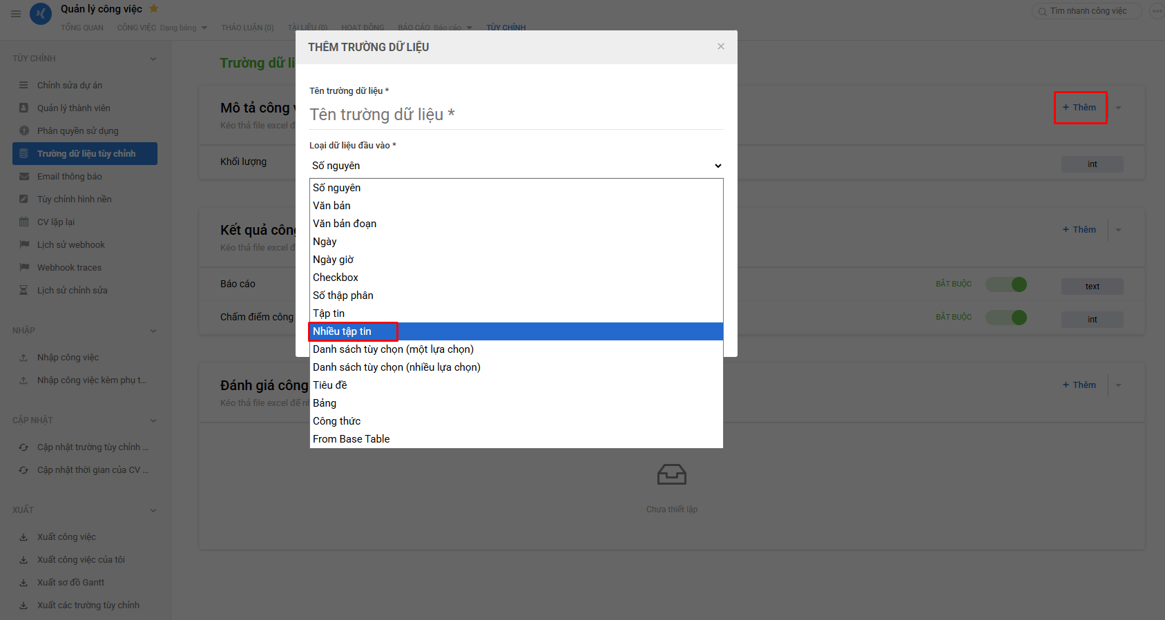 - Thiết lập theo từng dự án, Tùy chỉnh >> Trường dữ liệu tùy chỉnh >> Thêm: chọn Loại dữ liệu Nhiều tập tin.