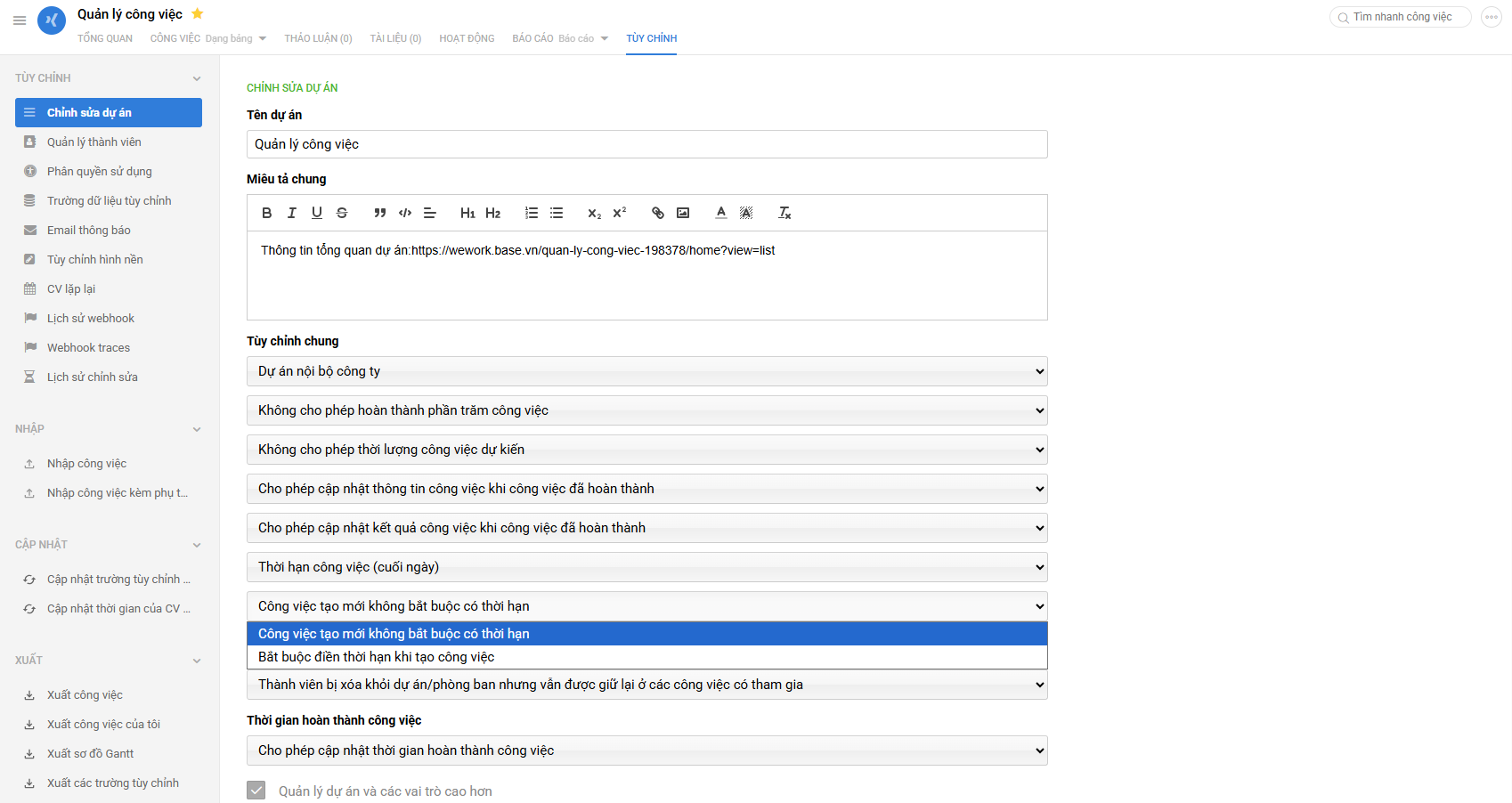 - Thiết lập theo từng dự án, chọn Tùy chỉnh >> chọn Bắt buộc điền thời hạn khi tạo công việc: khi đó bạn cần điền tên và thời hạn là 2 trường bắt buộc khi tạo công việc mới