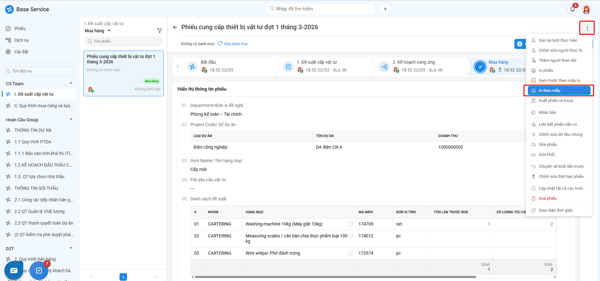 Bước 1: Truy cập app Base Service >> chọn quy trình cần thêm mẫu in >> click vào dấu "ba chấm" và chọn "Mẫu in"