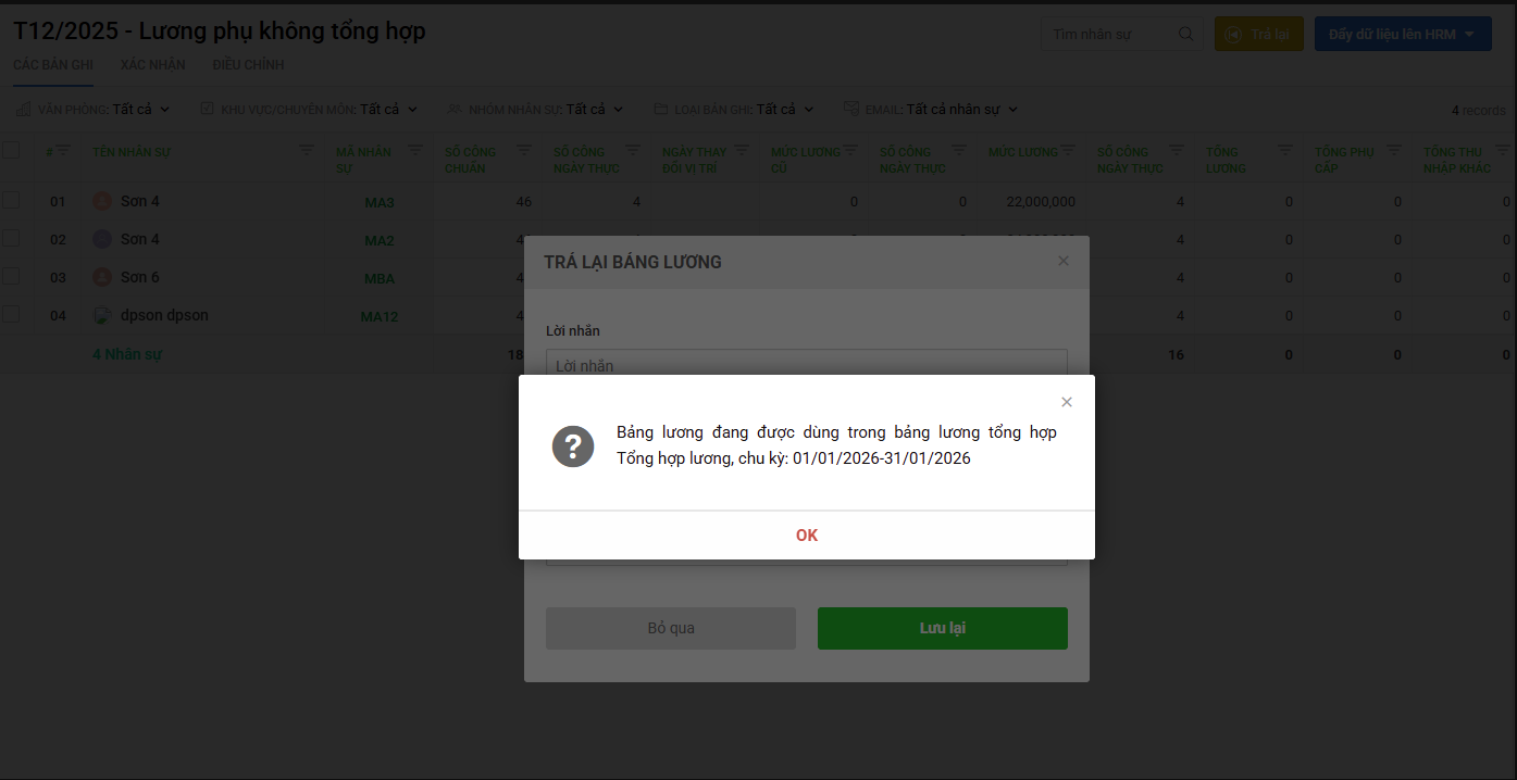 - Nếu bảng lương đã được sử dụng ở bảng lương tổng hợp khác hệ thống sẽ cảnh báo lỗi: