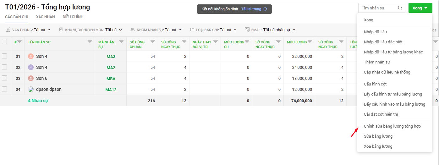 - Tính năng này chỉ hiện cho bảng lương chính là bảng lương tổng hợp và chưa được duyệt