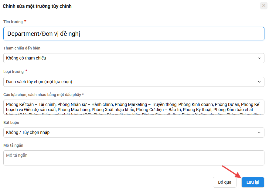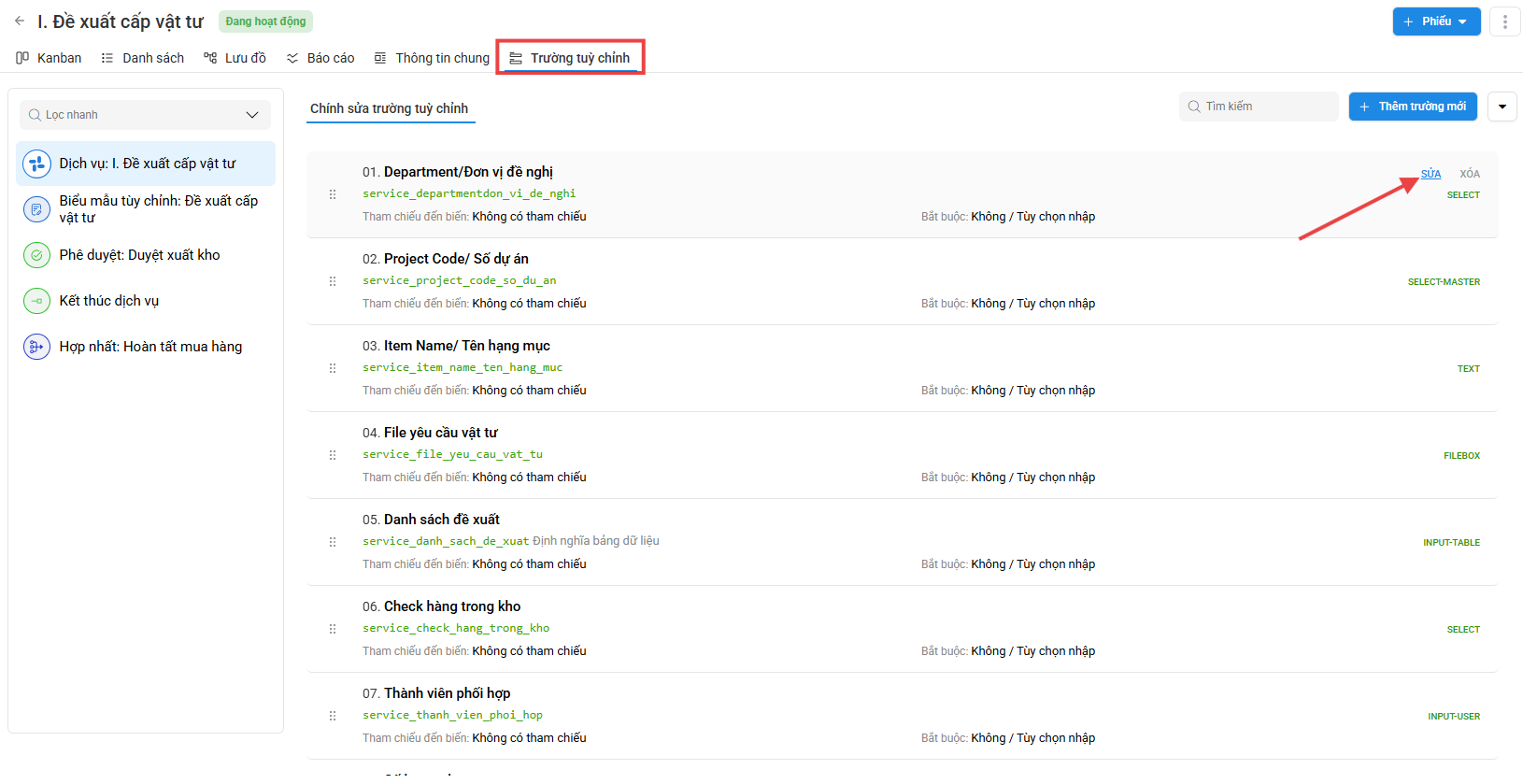 Để chỉnh sửa các trường dữ liệu tùy chỉnh của phiếu bạn làm theo hướng dẫn sau: