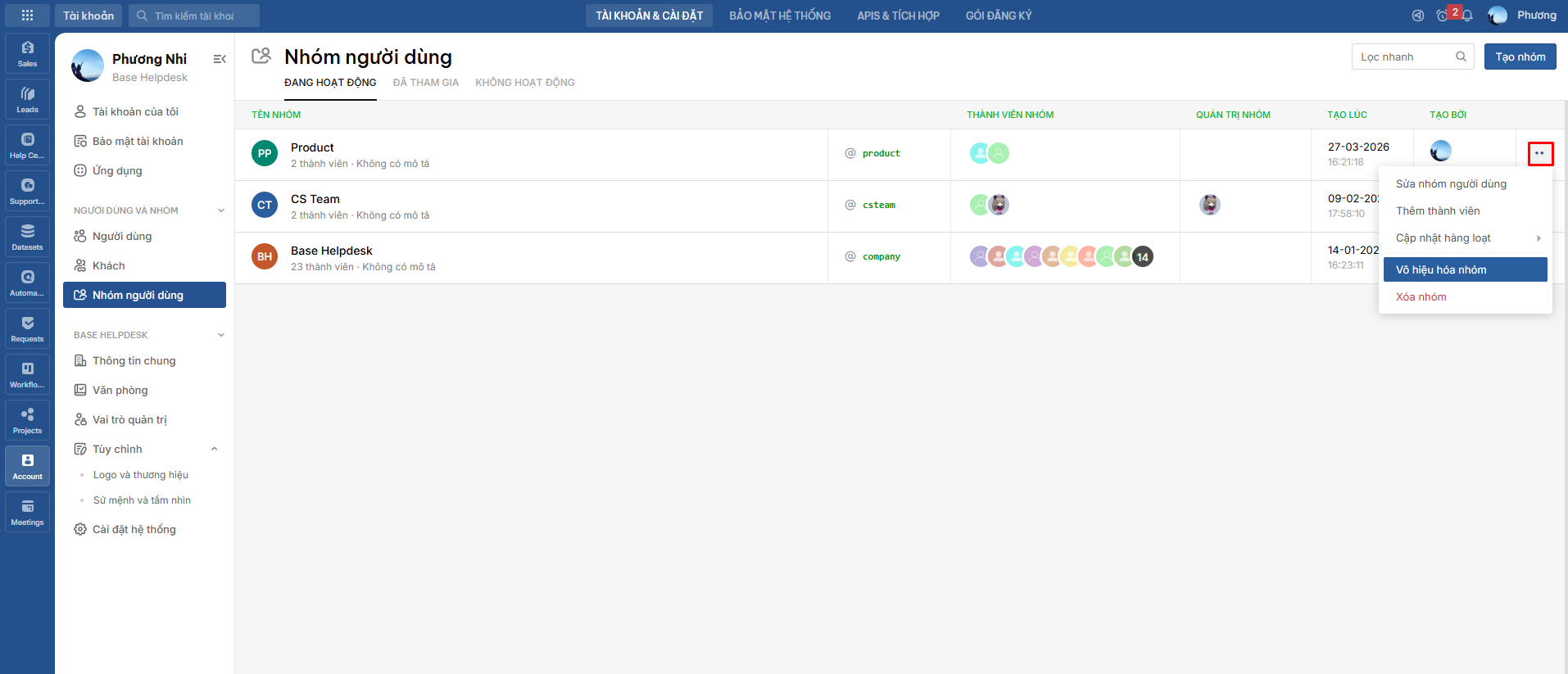 Bước 1: Tại tab Tài khoản & Cài đặt >> Nhóm người dùng >> Di chuột vài icon ".." của Nhóm cần xóa >> Vô hiệu hóa nhóm.