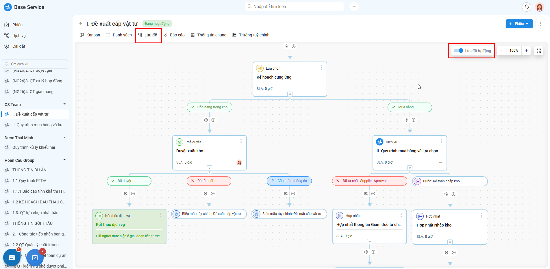 Bước 1: Tại dịch vụ cần thiết lập, bạn click vào mục Lưu đồ và mở lưu đồ tự động